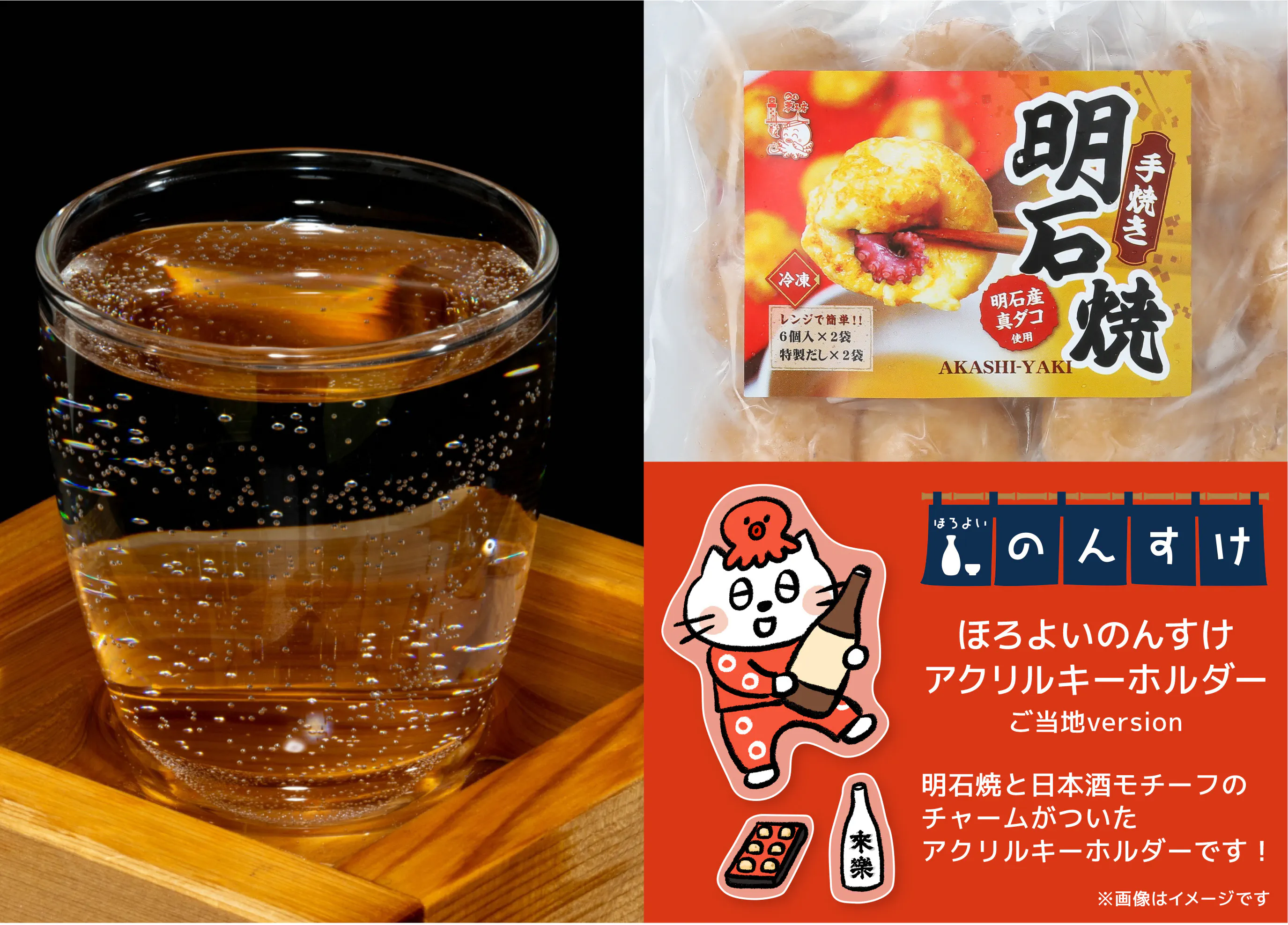明石地元の蔵元、茨木酒造初のアッサンブラージュにより完成した、オリジナルの日本酒1本と、明石ダコを使用して手焼きで作る本場の明石焼(6玉)入りが2パック(お出し4袋付き)に、「明石ご当地のんすけ」のアクリルキーホルダーに日本酒ボトルのチャーム付き1個。