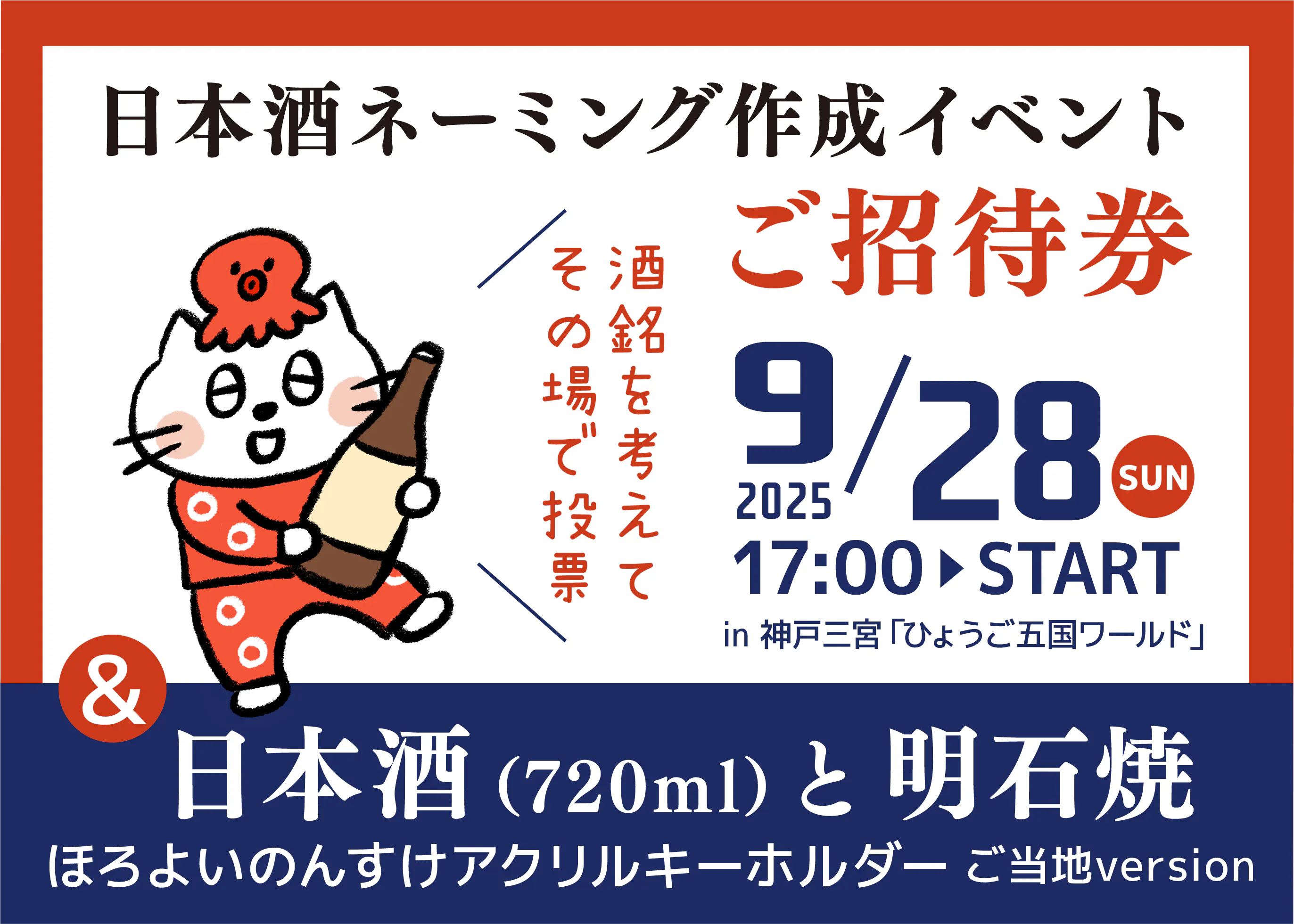 今年9月28日(SUN)に、神戸三宮「ひょうご五国ワールド」で開催します、「明石焼に合う日本酒」酒銘ネーミングイベントへご招待します。