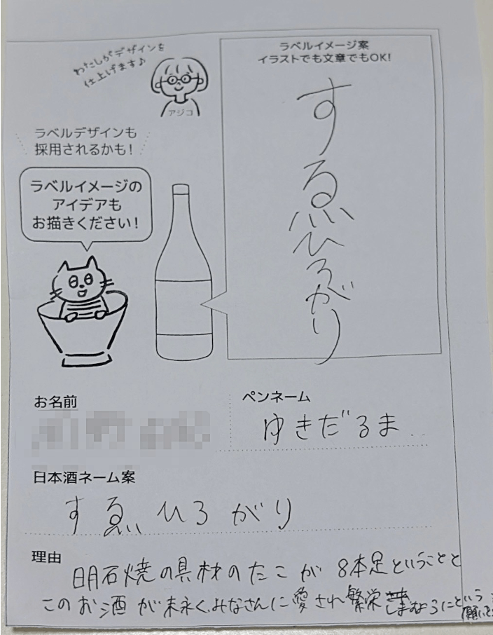明石焼きに合う日本酒に、ご支援・ご拡散いただきまして感謝いたします。先日メンバーにてネーミング検討会を行い、たくさんの素敵なネーミング案を頂いたので、悩みながら種々議論の結果、「すゑひろがり」に決定いたしました!理由はご提案者の説明にある、明石焼きの蛸が八本足で末広がり、このお酒が末長く愛され繁盛する願いを込めと云う内容に加えて、「ゑ」が蛸のイメージ。更に蛸つながりで八本足から、八につながる(酒好きの輪=八仙)と、色々物語が出来そう。また、サブネームとしても活用出来そうで、広がりがある。と言った事が決めてとなり、決定いたしました。現在、この名前が使用できるかどうかの調査と並行しまして、アジコさんがラベルのデザインに着手しております。次回にはラベルのデザインがご紹介できると思いますので、是非引き続きよろしくお願いいたします!