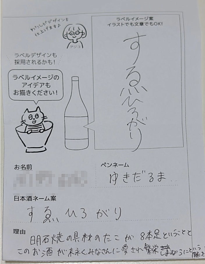 理由はご提案者の説明にある、明石焼きの蛸が八本足で末広がり、このお酒が末長く愛され繁盛する願いを込めと云う内容に加えて、「ゑ」が蛸のイメージ。更に蛸つながりで八本足から、八につながる(酒好きの輪=八仙)と、色々物語が出来そう。また、サブネームとしても活用出来そうで、広がりがある。と言った事が決めてとなり、決定いたしました。