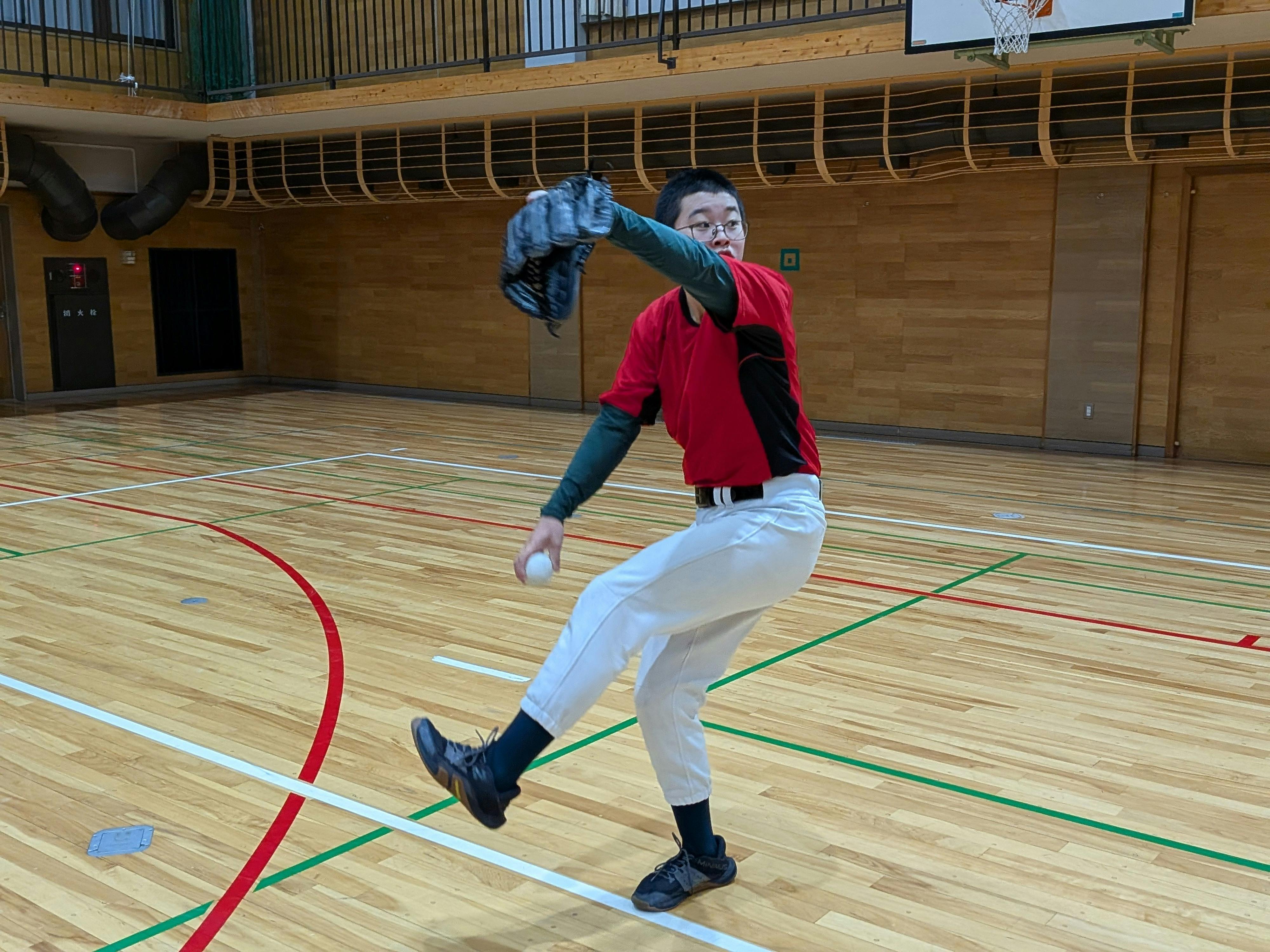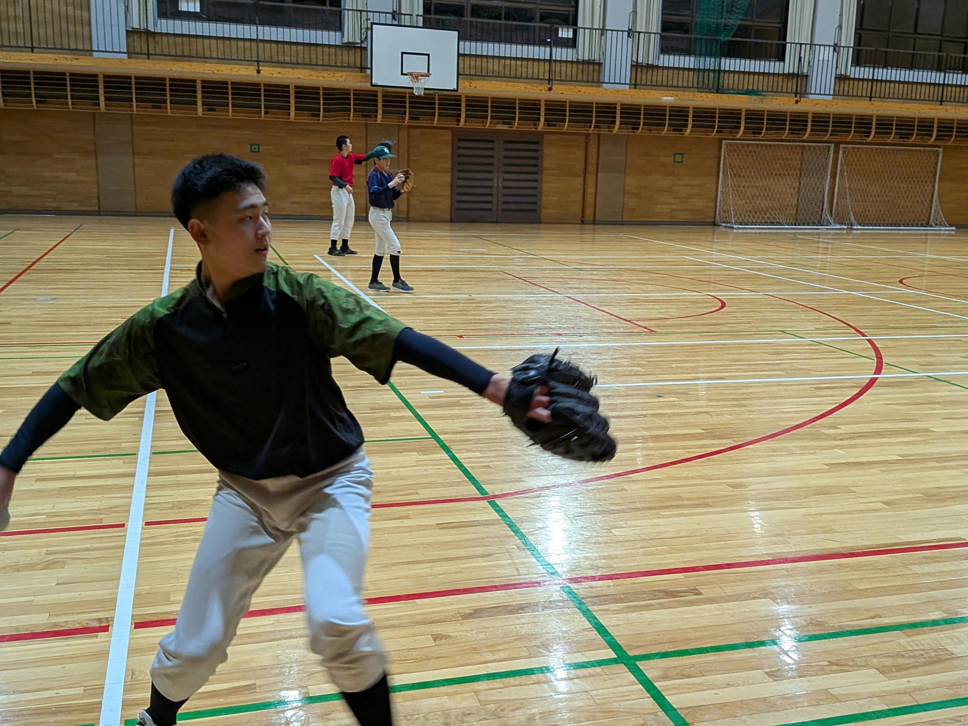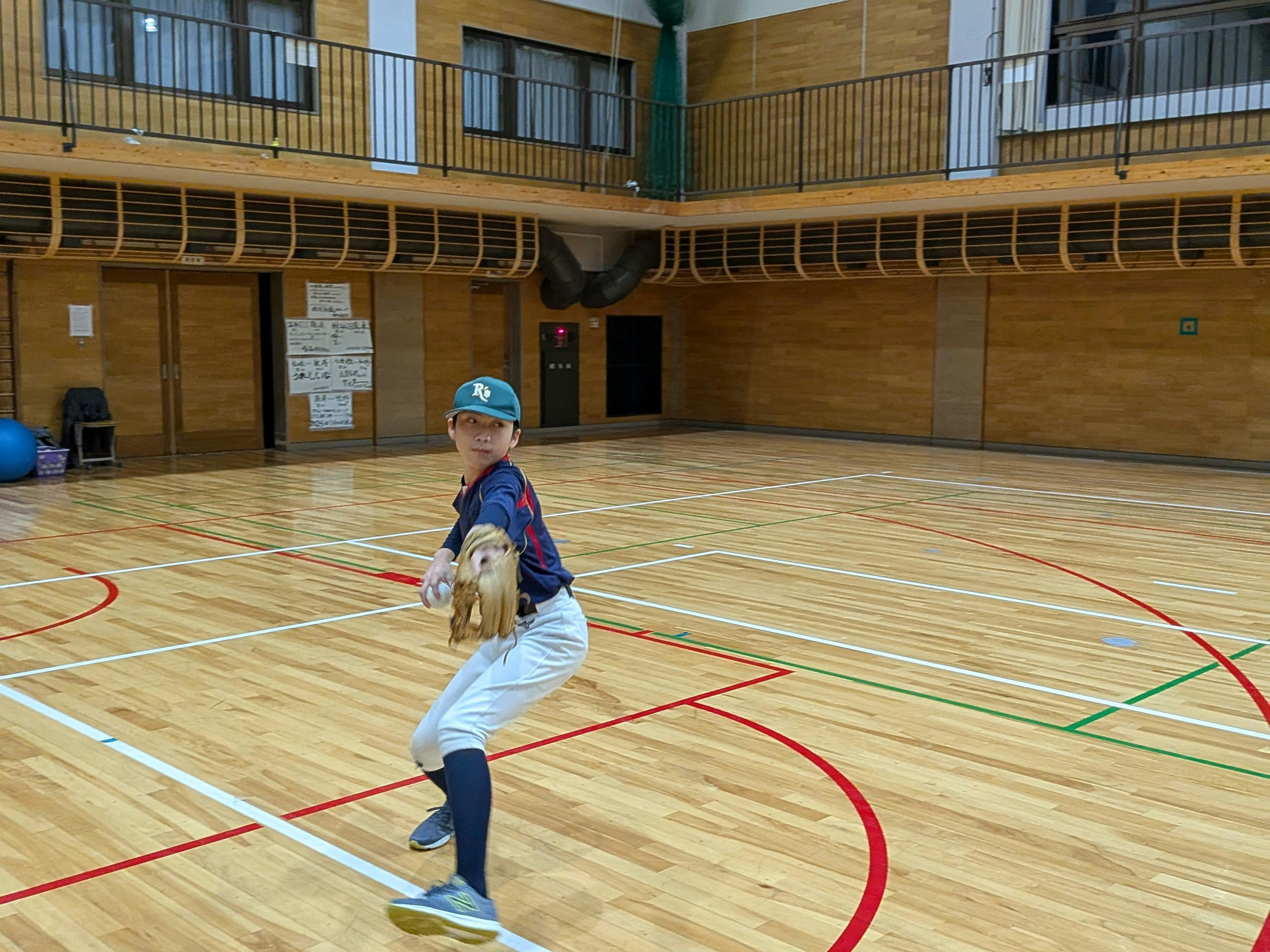 画像キャプション学校の体育館をお借りして、練習しています。今日の練習は肩甲骨と股関節の連動を意識して行います。