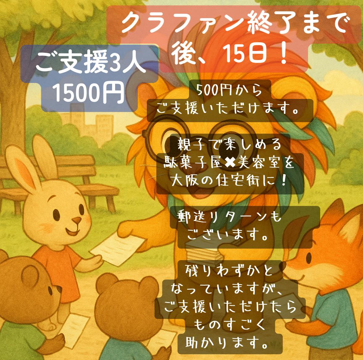 こんばんは。クラファンも残り14日となりました。支援者3人、1500円。これが、今の現実です。本当に、縁もゆかりもない方々にお願いをし続けるというのは、簡単なことではありません。「誰にも頼らずに…」と覚悟して始めた挑戦ですが、今はもう、頼れるのはクラファンしかない状況です。後悔したくない。家族と、そして応援してくれる方の気持ちに応えたい。だから、もう一度だけお願いさせてください。500円から、来店不要のリターンもご用意しています。どうか、私たち夫婦の挑戦を育てていただけませんか?どうか、最後まで見守っていただけますように。
