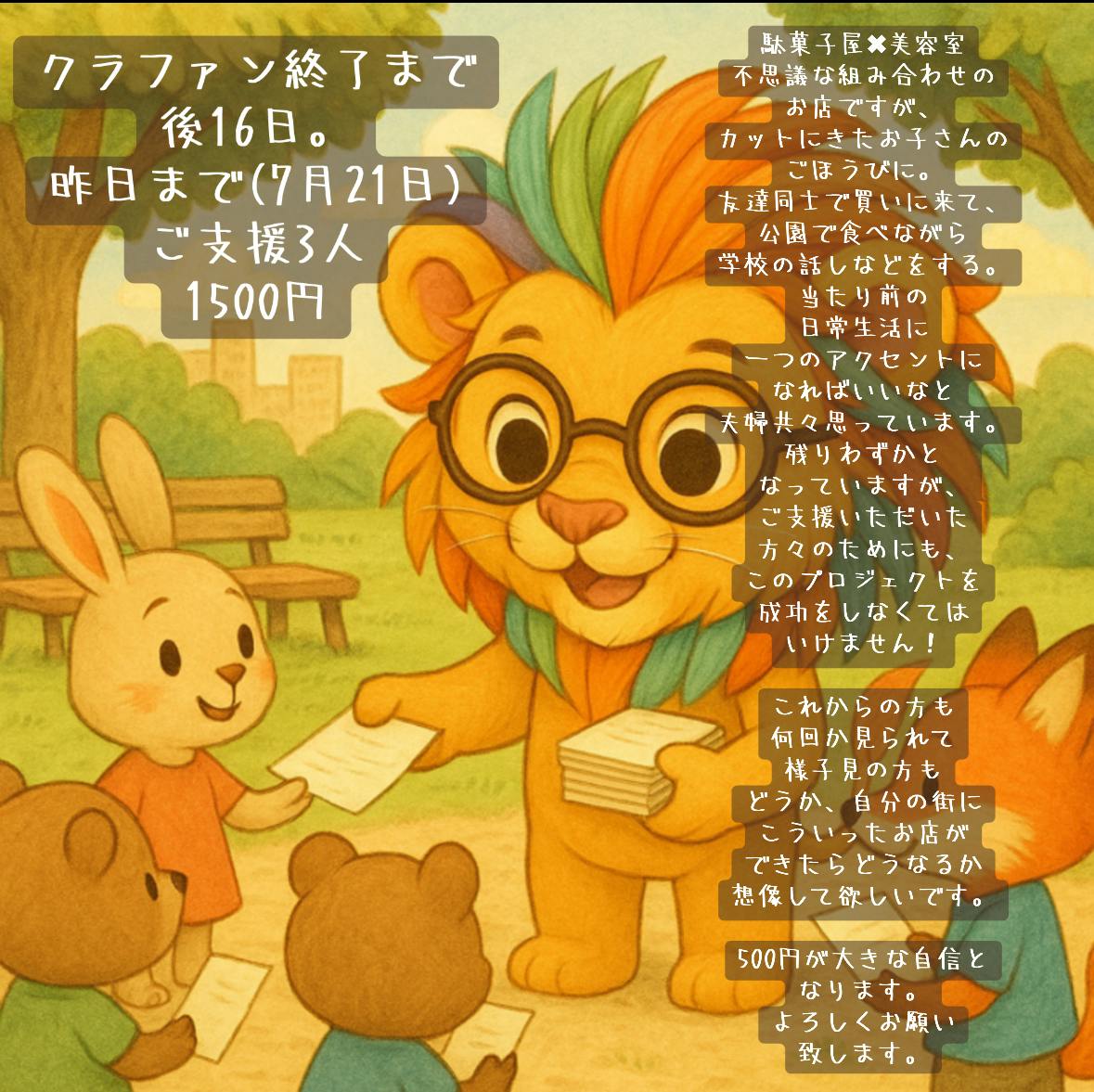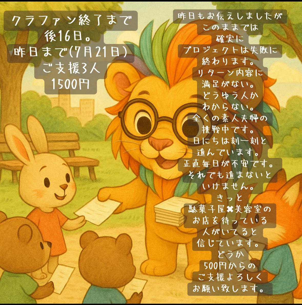 おはようございます。今日も朝から、僕たち夫婦はコツコツ動いています。クラファンがスタートしてから約1ヶ月。3人の方にご支援をいただきました。本当に、心から感謝しています。ですが——その日を最後に、新しいご支援は止まったままです。ページのPVもなく、SNSの反応もごくわずか。正直、かなり厳しい状況です。でも、それでも、やめたくはないんです。このクラファンは、「ただお店を作りたい」だけの挑戦ではありません。「親子でホッとできる時間を」「街にちょっとした元気を」そんな“人と人の温もり”を届ける場所を作りたい。そのための最初の一歩なんです。僕たちはごく普通の夫婦です。たくさんの人脈も、大きなフォロワーもいません。でも、だからこそ、地に足つけて、1人ひとりと繋がることを大事にしています。来店不要のリターンもご用意しています。遠方の方も、ご支援というカタチで仲間になっていただけたら嬉しいです。どうか、僕たちの小さな挑戦に、もう一度目を向けてもらえませんか?最後まであきらめず、伝え続けます。