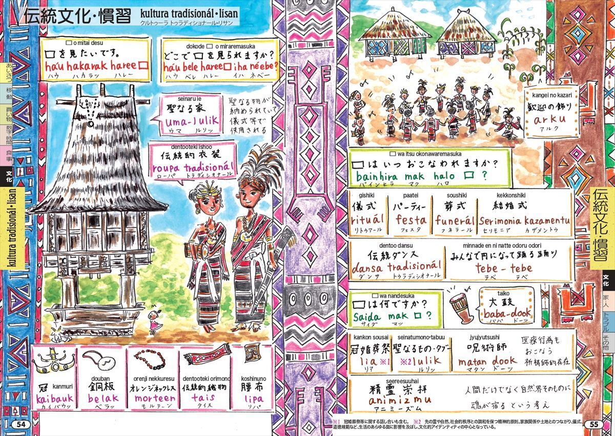 イラストでは、東ティモールの神話に登場するワニをはじめとして、ジュゴンにトケ(トッケイヤモリ)、ニワトリ、水牛など、地元で愛される動物たちが愛らしいキャラクターとして登場!手描きのイラストと文字とともに、やさしく、わかりやすく、フレーズを紹介します。