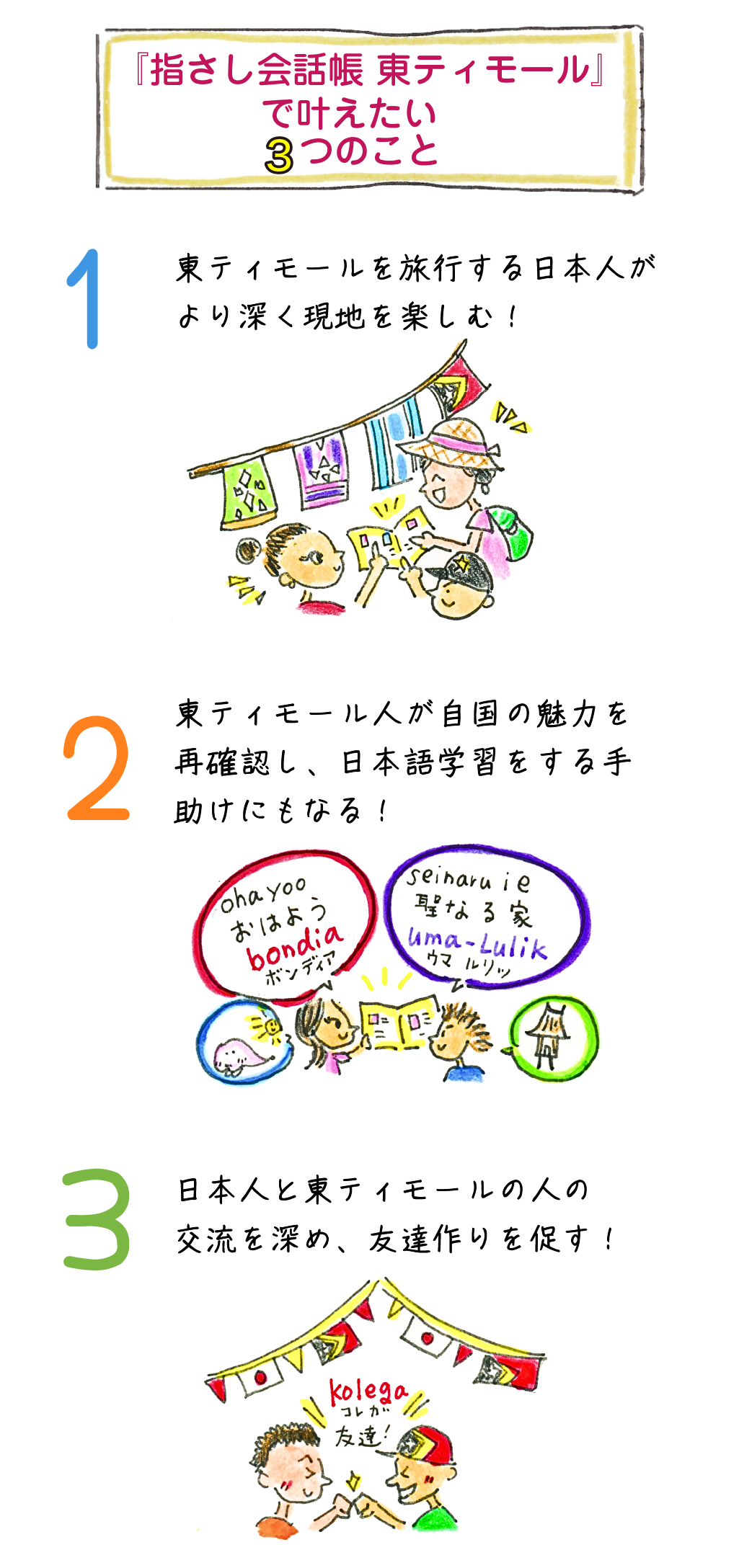 そこで私たちは、指さし会話帳を発行する「株式会社ゆびさし」さんと、東ティモールにご縁のある皆さん、そして私たちの想いに共感してくれる皆さんといっしょに、会話帳を作って以下の3つのことを実現したいと考え、クラウドファンディングを立ち上げました!