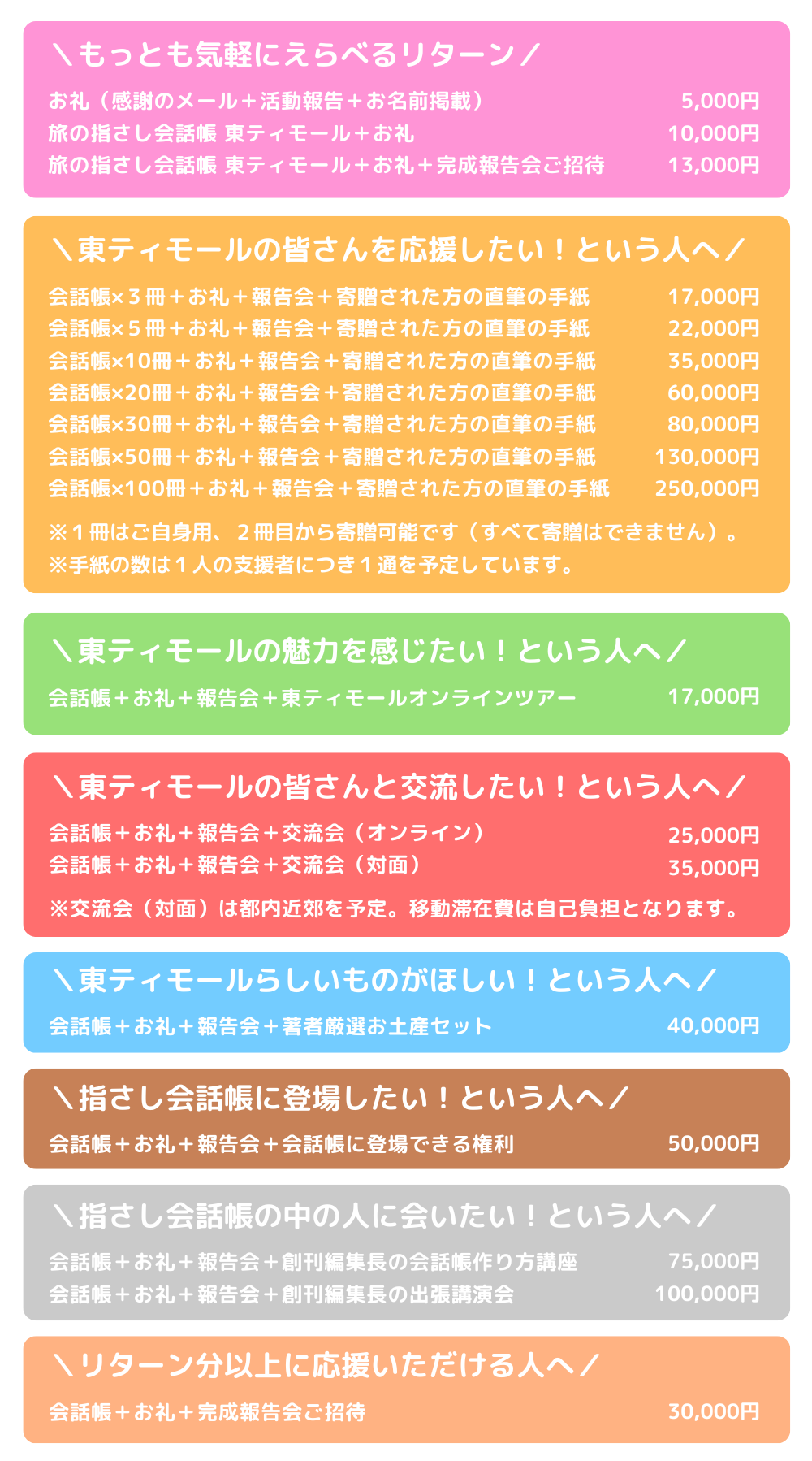 リターンは、東ティモールゆかりのモノや体験から、指さし会話帳のファンに向けたものまで。