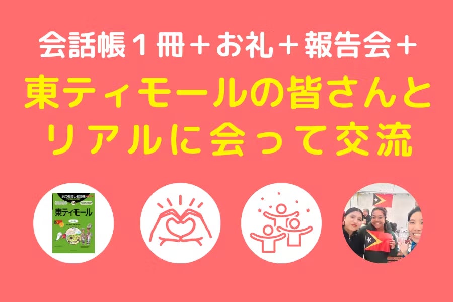 さて、ネクストゴールを発表するときに、国内の東ティモール人の方々への会話帳の寄贈と、リターンを通して東ティモールの魅力を伝える、ということが書かれておりました。それはネクストゴールの300万円を達成した今も、変わりはありません。ただひたすらに、会話帳を通して東ティモール人の方の日本語習得に役立ち、クラファン(リターン)を通して東ティモールの魅力を伝える、言わば、「東ティモールと日本を心の友に」というところに焦点を絞っております。