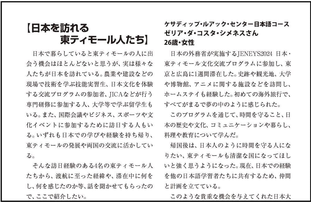4名の訪日経験のある東ティモール人のコメントを掲載。アグスさんもこのページに登場いただきます。