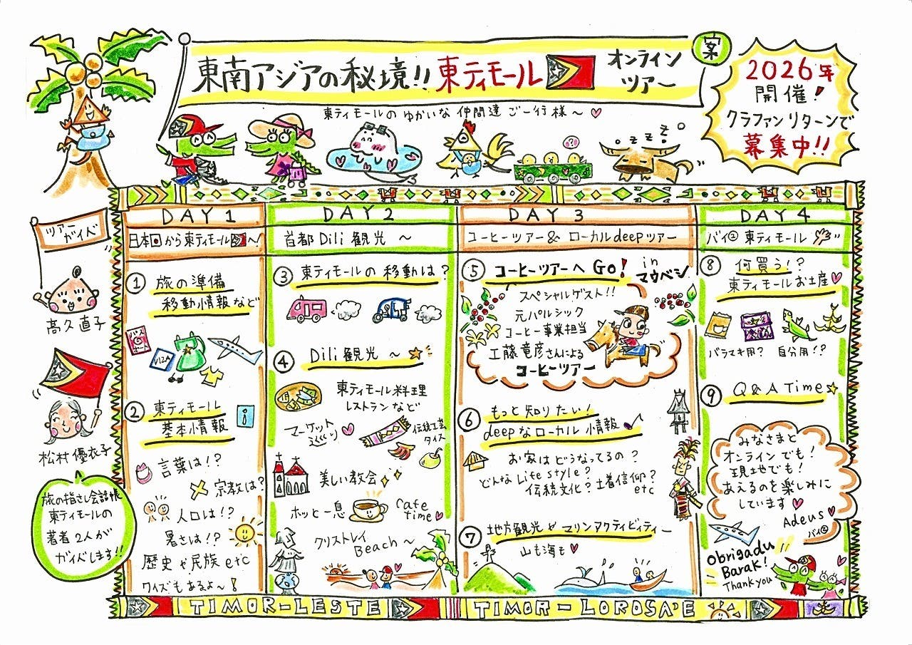 そんなリターン、メンバー間で練りに練ってすっっっごい面白いのができた!と思っていたら、あまり選ばれていないリターンもあります…!今回はそのひとつ、「東ティモール オンラインツアー」について、実際に本番ではガイド役を担う会話帳著者の髙久直子さんと松村優衣子さんに教えていただきました!