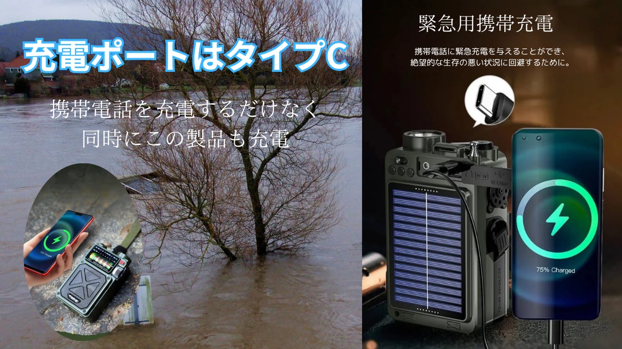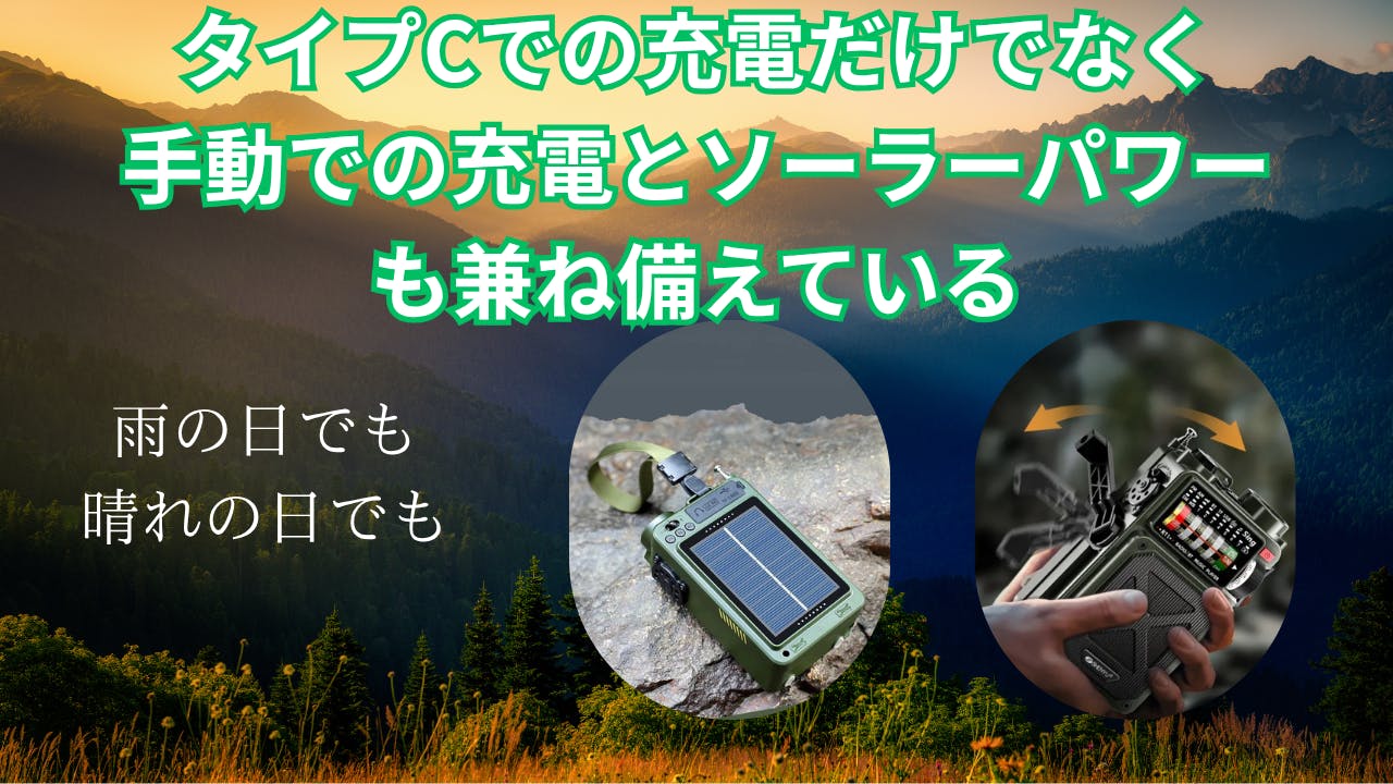 ソーラーパネル充電: 太陽光での充電が可能です。ハンドクランク充電: 手動で発電し、充電できます。タイプC充電: 最新のタイプC充電ジャックを使用しており、より便利で迅速な充電が可能です。