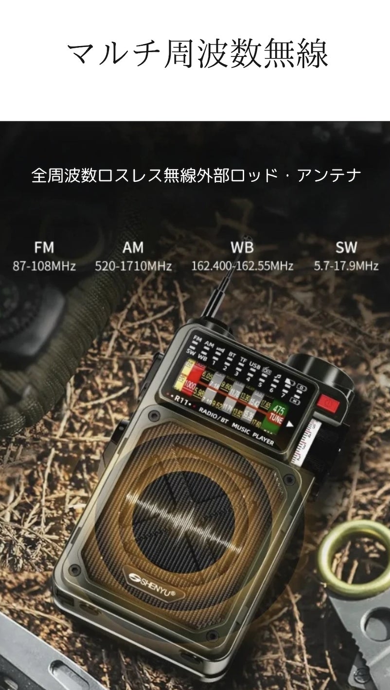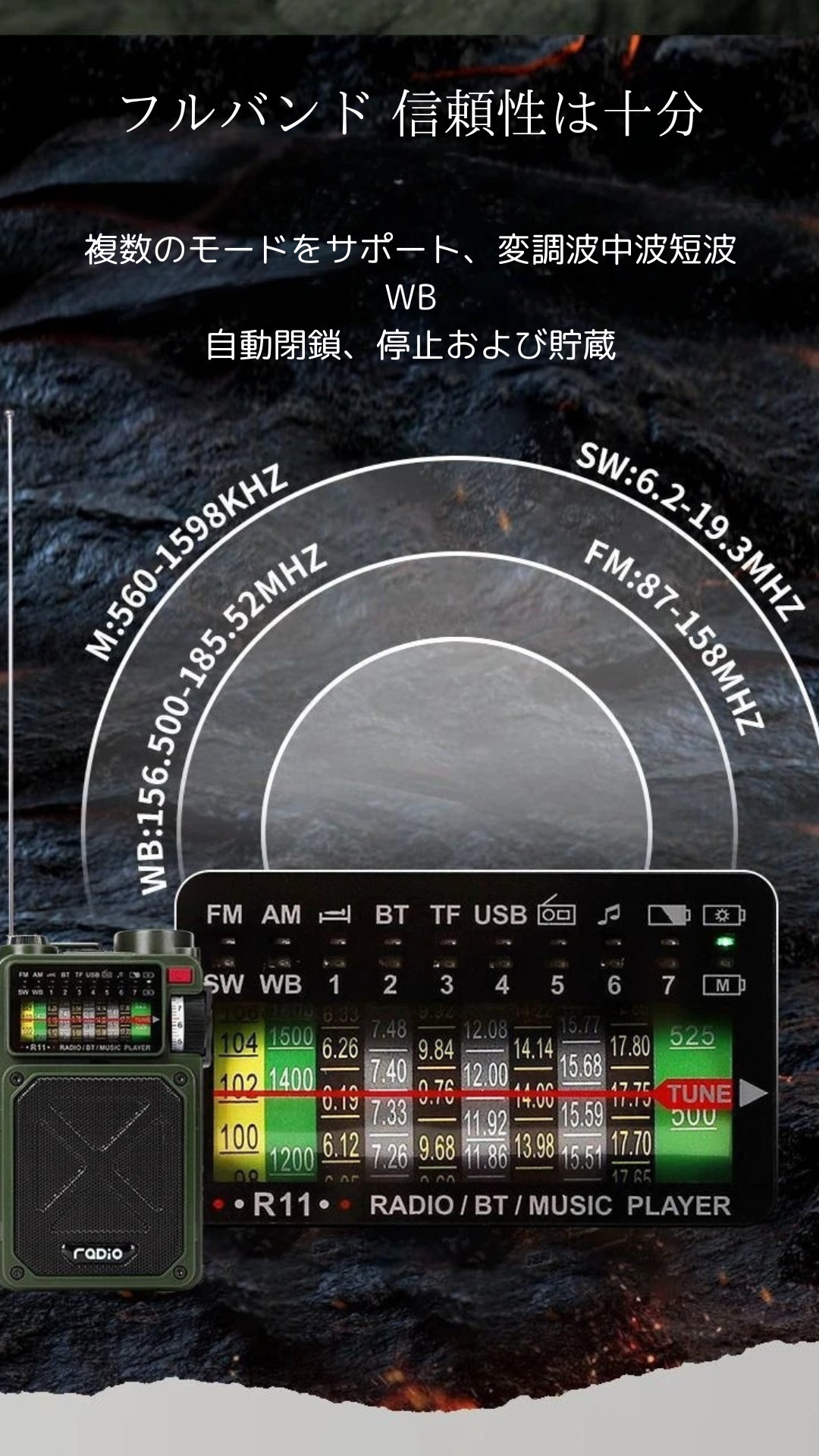 AM/FM/SW/WBバンド: このラジオは、AM/FM/SW/WBバンドを受信可能で、70台のワークステーションを個別に保存できます。緊急時の気象警報には対応していませんが、日常のラジオ受信には十分なパフォーマンスを発揮します。