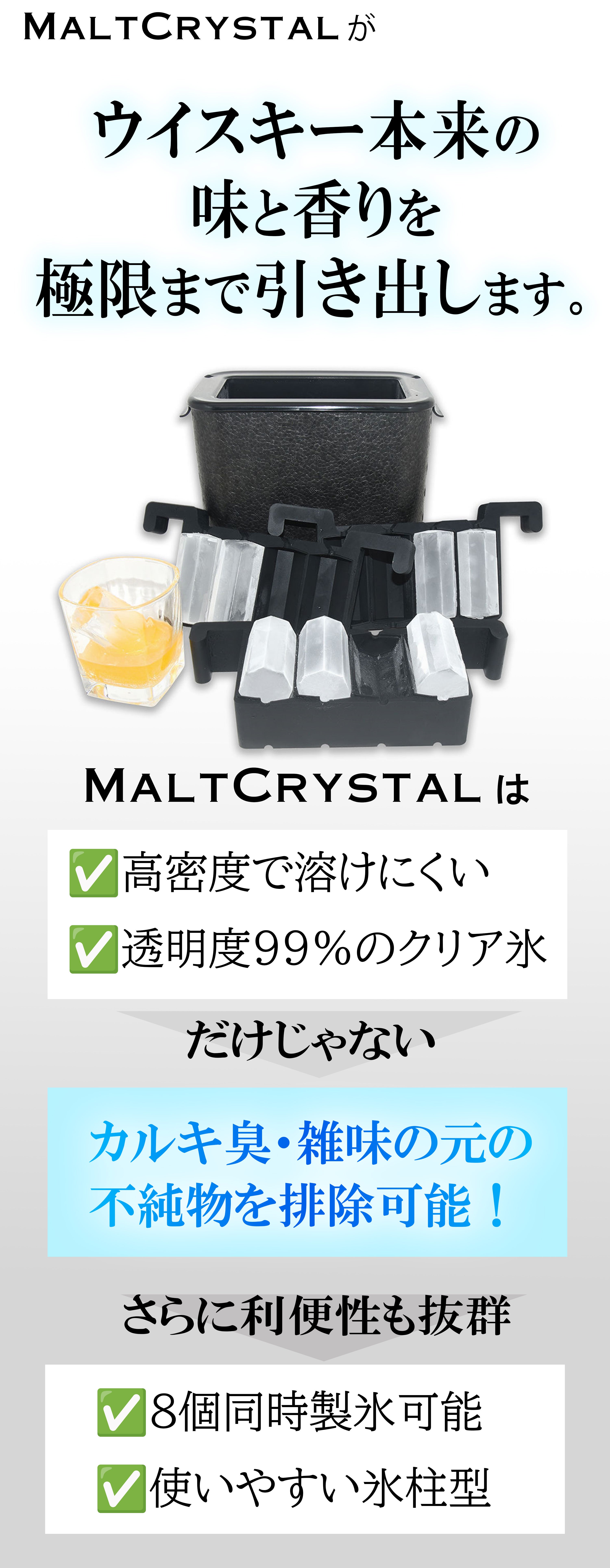 MALT CRYSTAL(モルトクリスタル)は、そんな家庭冷凍庫の常識を覆す透明氷を、誰でも簡単に作れるようにしました!