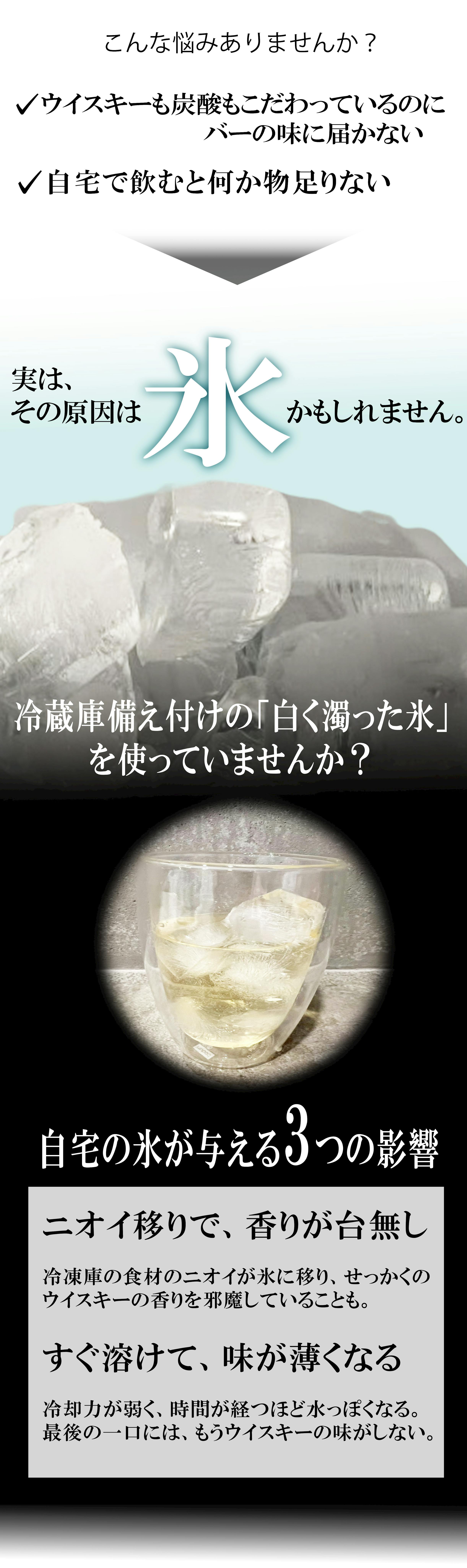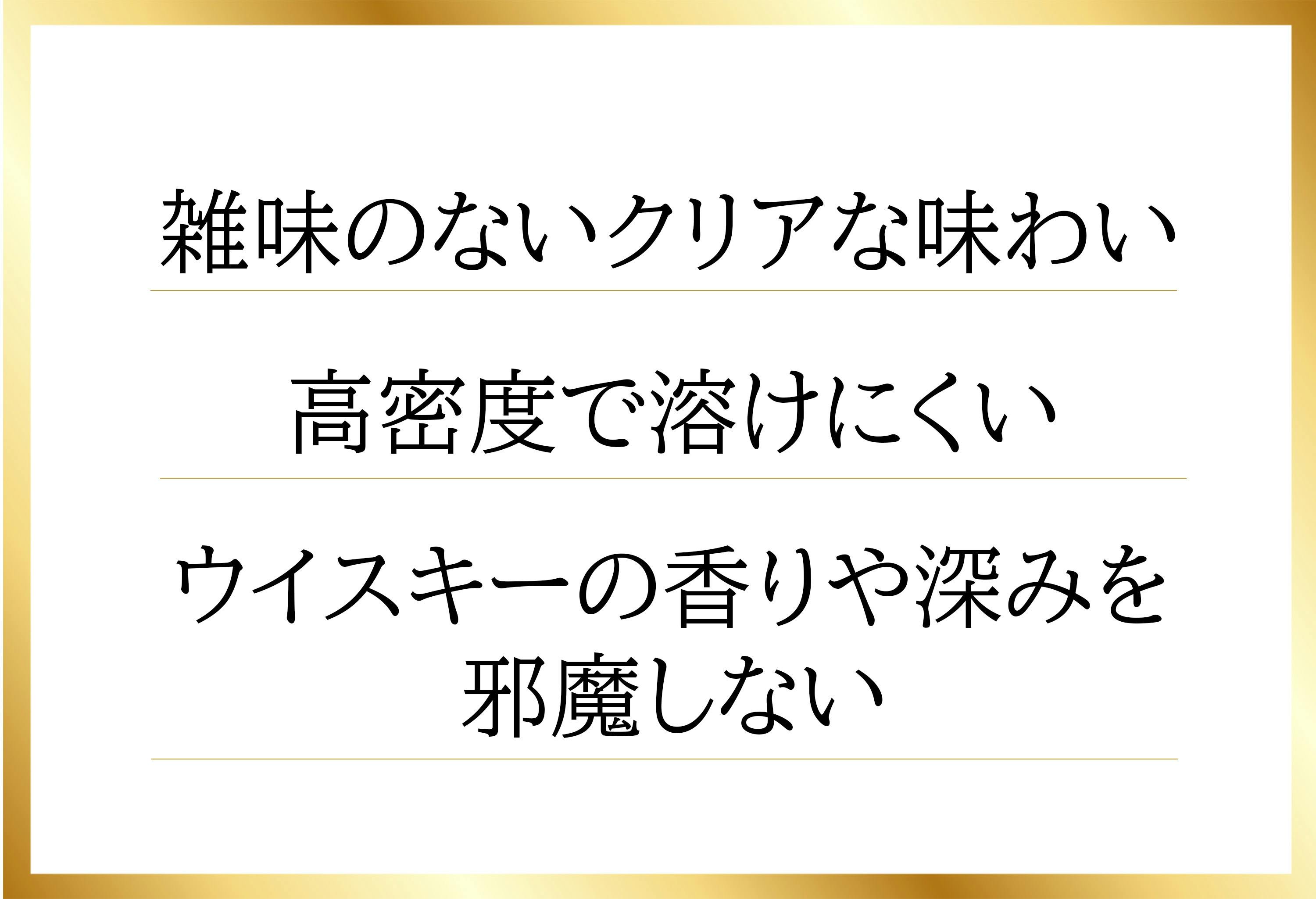 美しい見た目と、氷が溶けにくいことによる“雑味のないクリアな味わい”が、ウイスキーやハイボールなどのお酒の風味を一切邪魔せず、最後の一口まで極上の一杯を堪能させてくれます。
