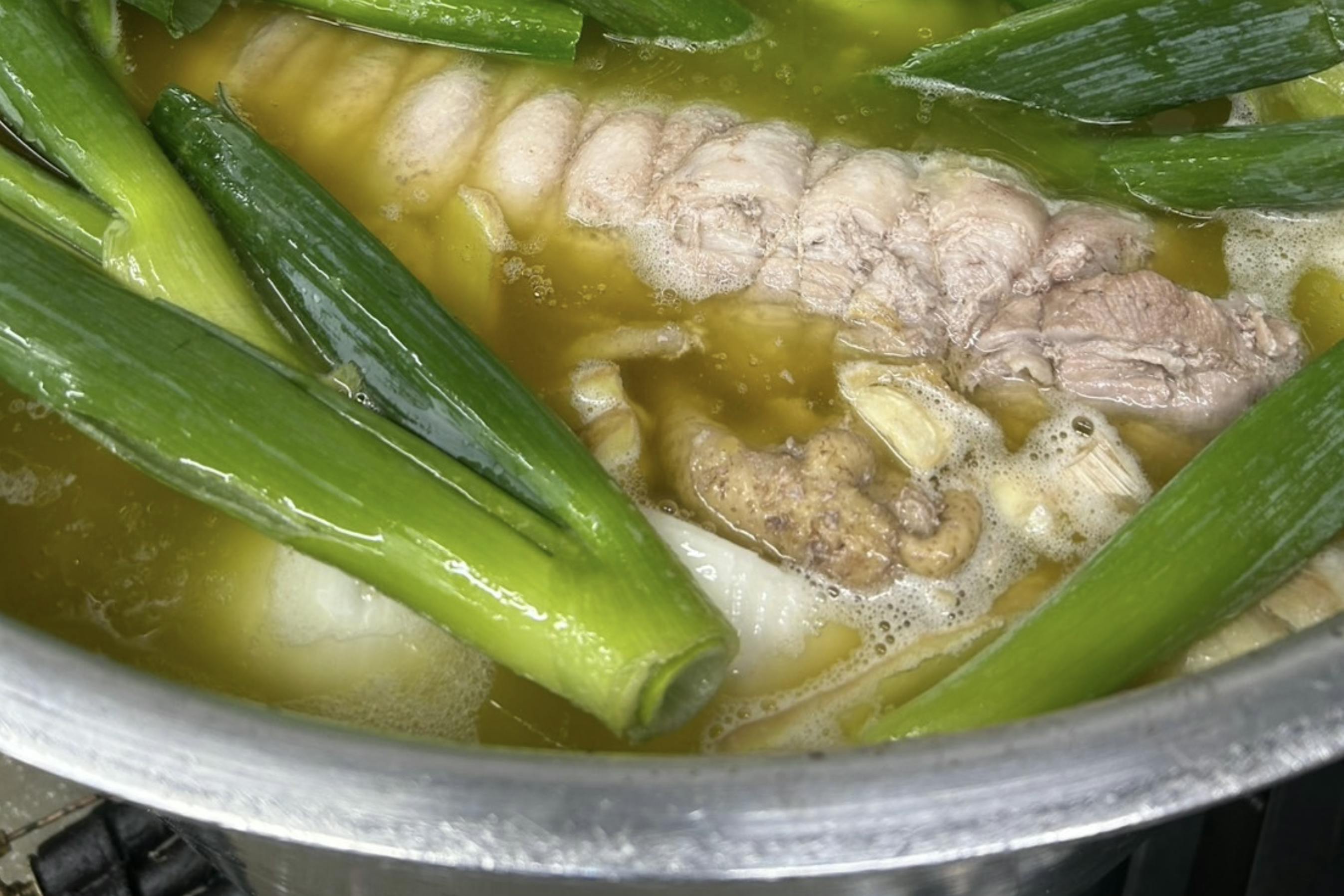 塩らーめん専門店くじらのスープは、鶏ガラ、豚背ガラ、もみじ、豚足がメインに、チャーシュー用の豚バラ、まぜそば用のミンチ、たくさんの野菜(淡路のたまねぎ、国産のしょうがとにんにく、白ねぎの頭)でスープ出汁を作っています。