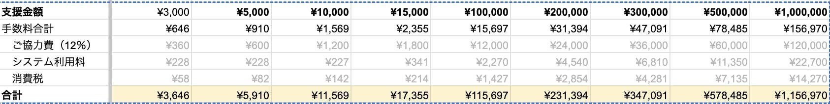 ※内訳は「支援金額+手数料(ご協力費+システム利用料+消費税)の合計」となります。
