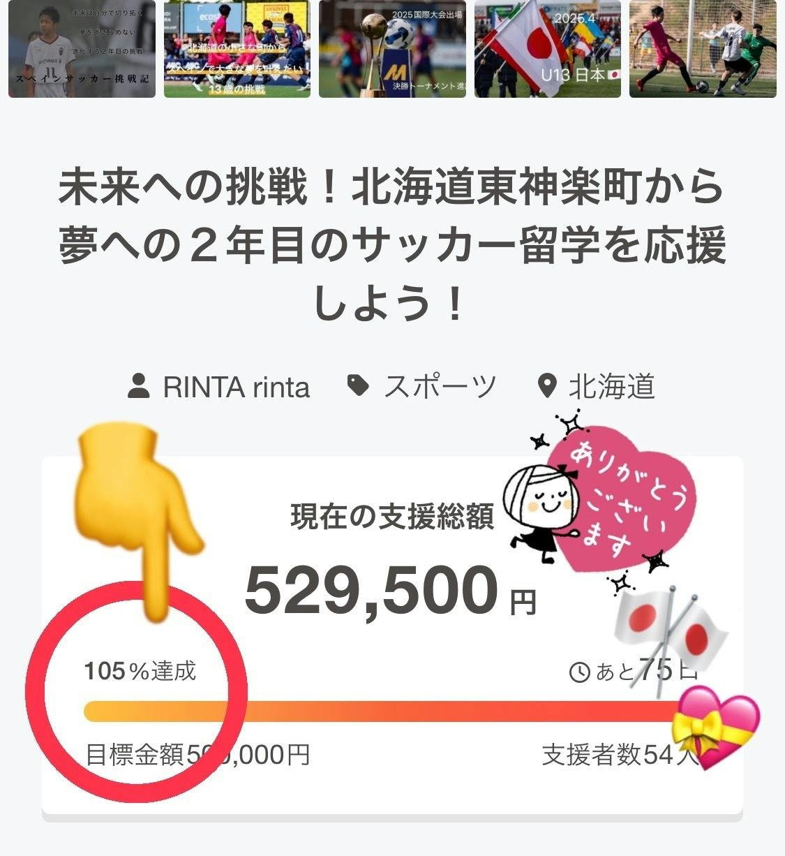皆様にご報告と感謝プロジェクト開始4日目にして目標金額の達成することができました!たくさんの拡散、メッセージ連絡、ご支援、ご協力頂き誠にありがとうございます。予想をはるかに超えるスピードでのご支援、ご協力を賜り、ひとりひとりにお礼をお伝えする時間がなかなか難しく申し訳ありません。現在スペインへの渡航費を達成致しました。諦めないチャレンジを継続して更なるステップへむけてプロジェクトを見直しております。大変恐縮ですが、引き続き13歳の夢への挑戦にお付き合い頂けましたら幸いです。