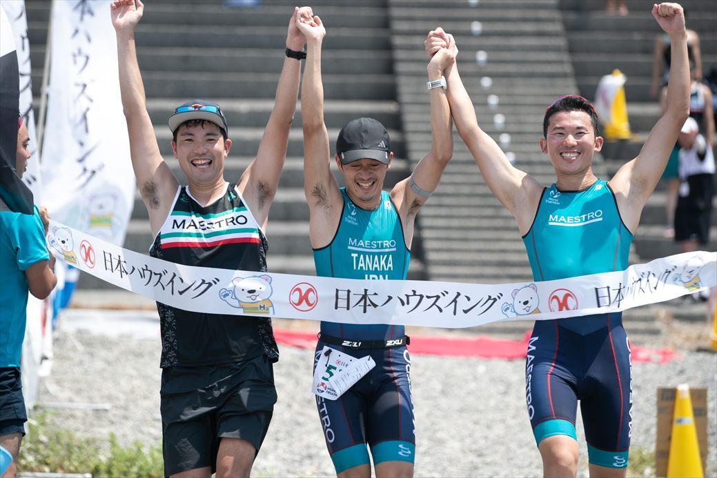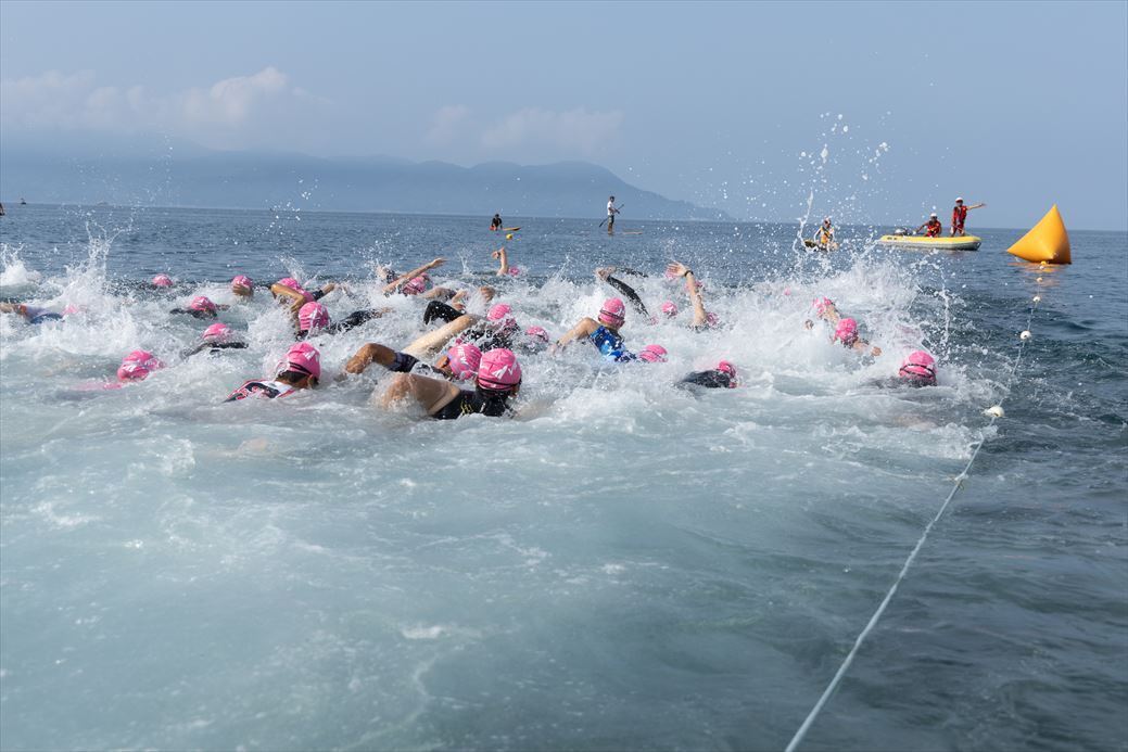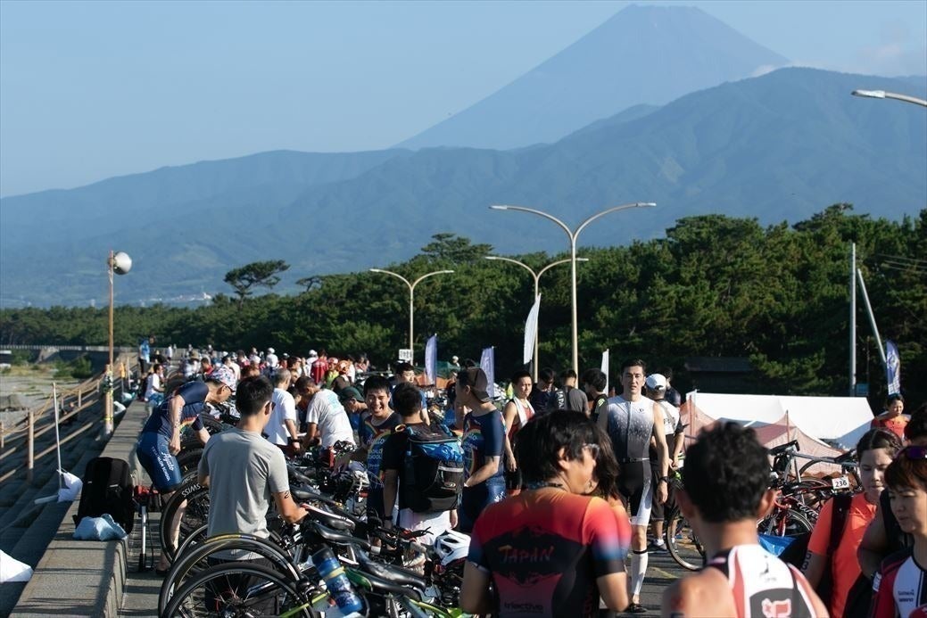 環境省より『水質が特に良好な水浴場TOP10』に選定されたこともある会場でのスイム、富士山を仰ぎ見ながらのバイク、そして松林の木漏れ日が降り注ぐ中のラン。例年、まさしくギラギラの太陽の下での真夏の大会ですが、多くの笑顔が溢れています。