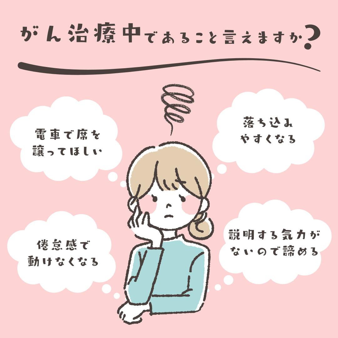 抗がん剤やホルモン治療などによる副作用で体力が落ちたり、気分の浮き沈みがあったりしても、外見は以前と何も変わらないように見えることが多いのが、がんの治療中です。