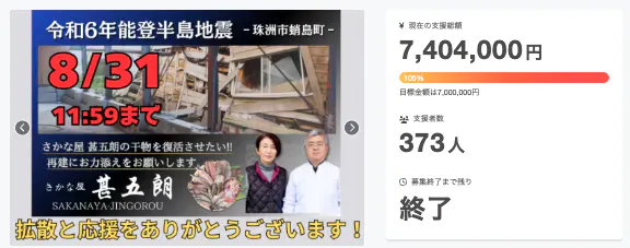 目標金額を超えた場合は、主に建物の再建と設備機器の修理、購入費に充てたいと考えております。このほか、広報/宣伝費、本プロジェクトの運営費他、「さかな屋 甚五朗」再建費用に使わせていただきます。