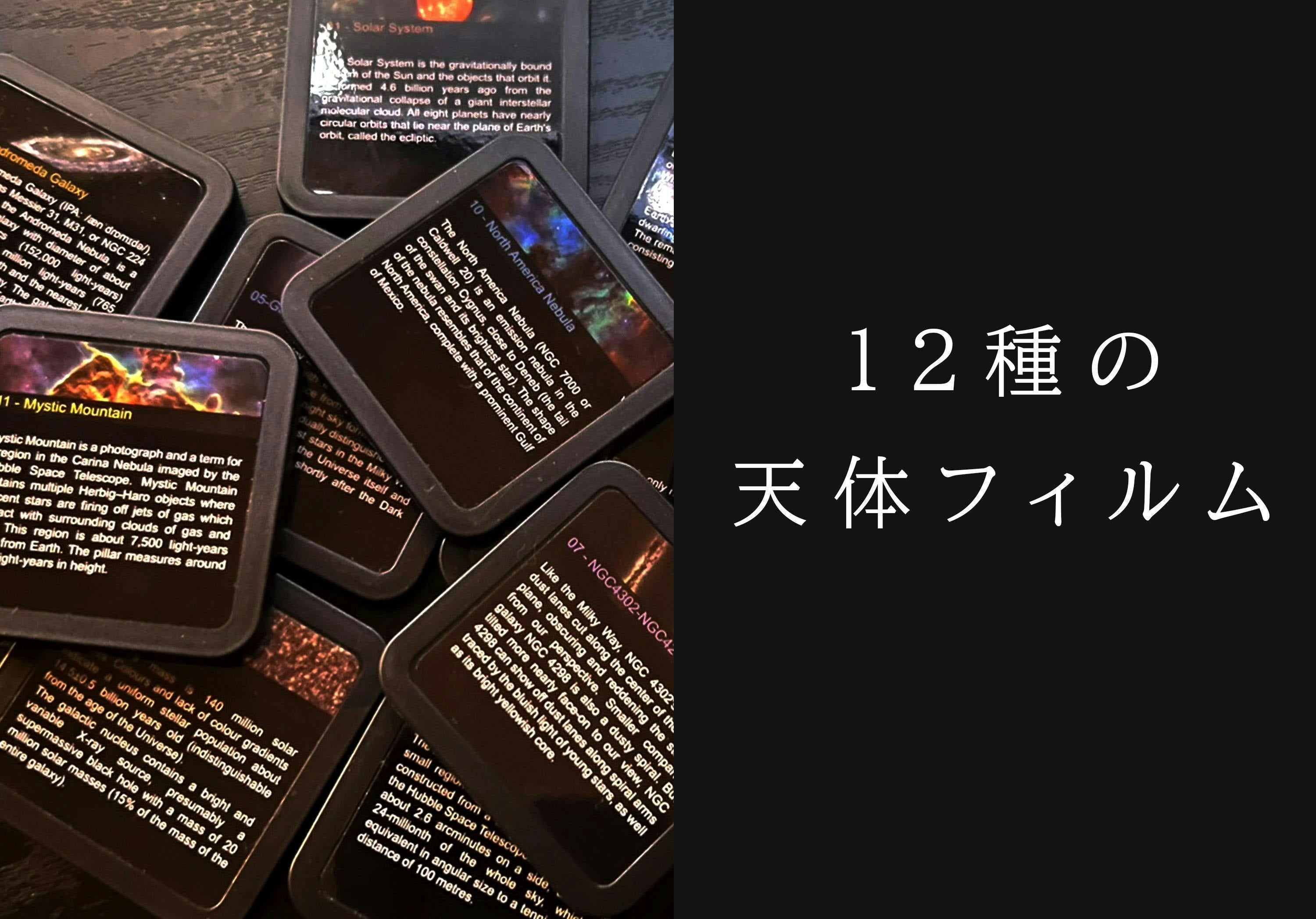 投影フィルムを12種類ご用意。星、天の川、月、太陽系、地球、星雲様々な種類を取り揃えました。