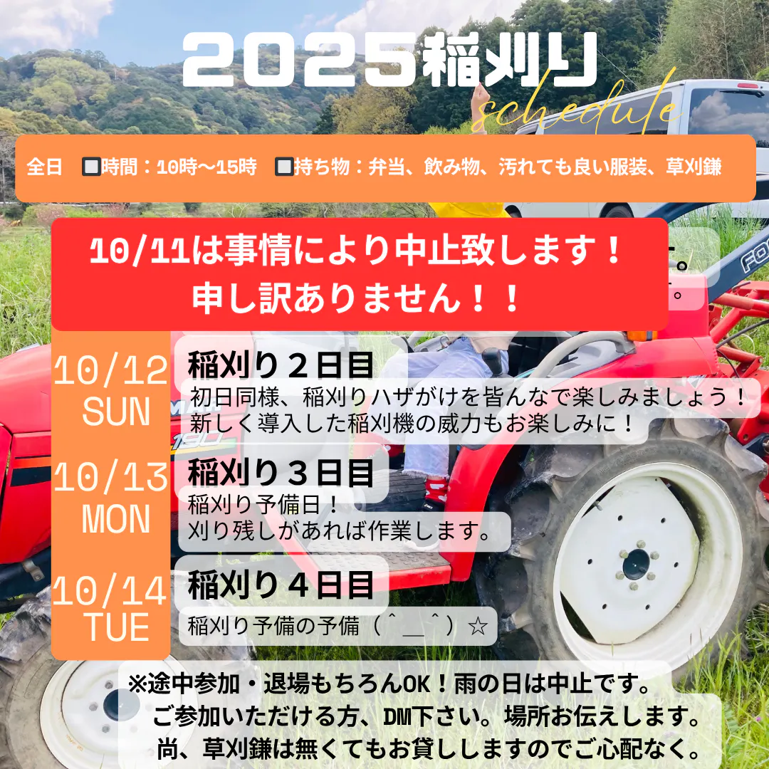 2025/10/12 22:07こんばんは(^o^)今日は稲刈り初日でした☆地元のお友達など、総勢7家族(20名を超える)もの方々が来てくださいました!開始早々、購入したバインダーが上手く働かず、結局皆さん手刈りでの作業になりました( ; ; )想像以上に時間がかかってしまい、そして皆さんが想像していた以上にハードな現場になってしまい、本当にすみませんでしたっ!!途中には雨にも降られて・・・(T . T)でも、とても思い出に残る稲刈り初日だったのではないでしょうか(^_^*)さらにさらに、こちらのクラウドファンディングからのご縁が繫がり、遠方からわざわざ今日の稲刈りに足を運び、一緒に稲刈りを行ってくださる方が見え、本当に本当に嬉しい一日でした(^o^)稲刈り機が不調になり、先行きが危うくなりましたが、これまた素敵な農機具屋さんに救われて、明日は早朝からメンテナンス後の機械を持ってきてくださることになりました。私たちの米づくりは沢山の方に助けられて何とか出来ています。本当に本当にありがとうございます。簡単ではありますが、進捗をご報告させていただきます。続報をまた投稿させていただきます!! もっと見る