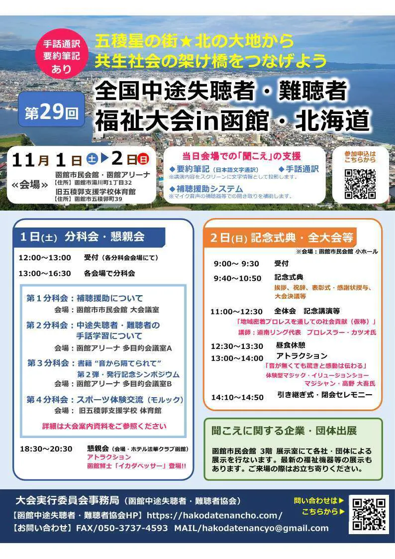 この大会は、全国の中途失聴者や難聴者、ご家族や友人、支援者、一般の方々が参加して、聴覚障害のさまざまな問題を提示し、解決へ向けて情報を共有し討論する場であります。北海道では2回目、函館では初めての開催となります。
