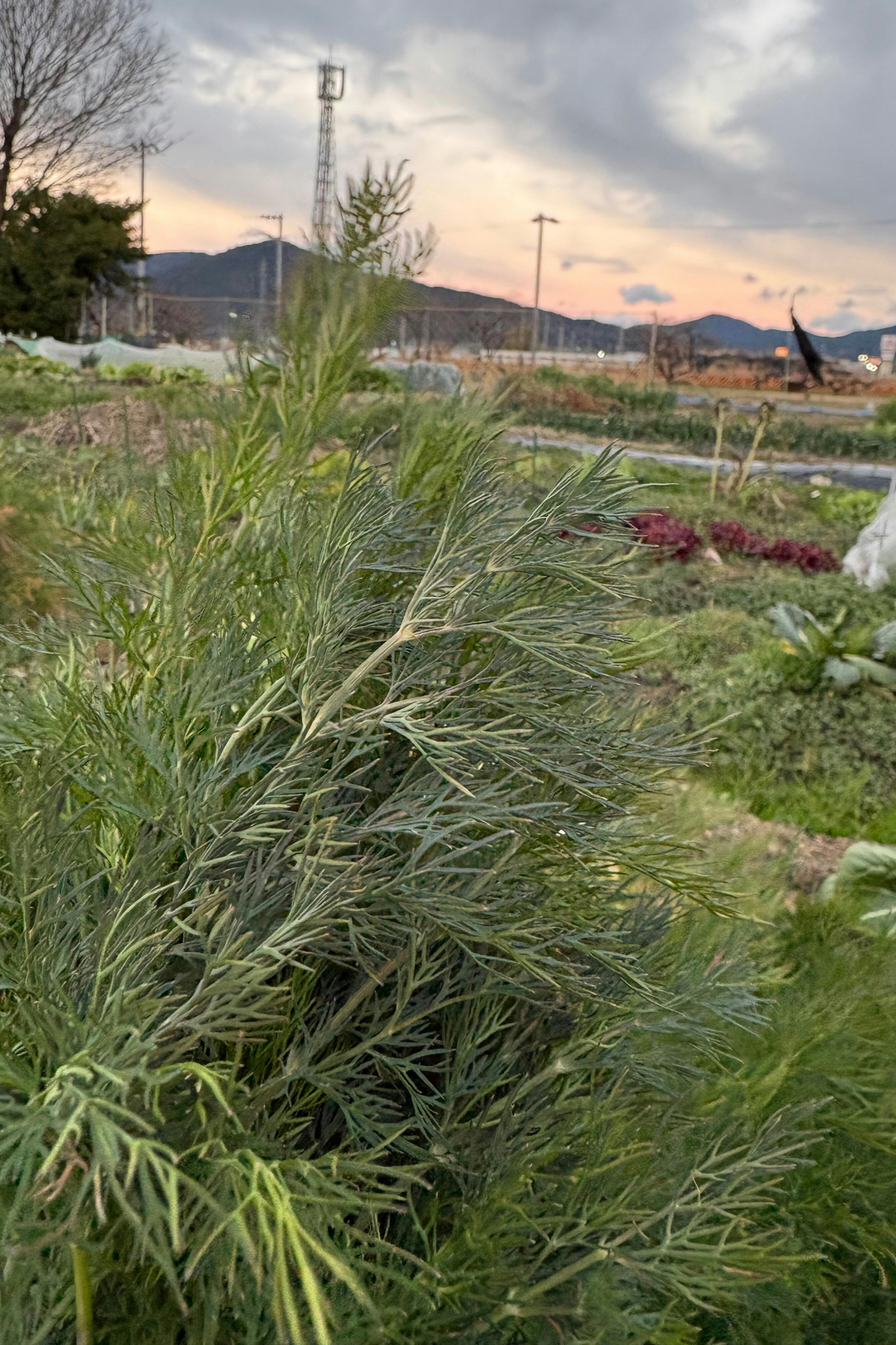 大門醸造の畑です。写真はディルというサーモンなどの魚料理に合うハーブです。醤油はもろみを布に入れしぼって、液体の醤油と残りの醤油粕とに分かれます。この醤油粕昔は冬の間に田んぼにまいて、雨ざらしにした後、春になって耕すとよい土の肥やしになったという話から、畑の土に混ぜて処理をしています。チッ素分が多い醤油のしぼり粕は、天然由来の肥料としても有用です。その畑から、希少なハーブなどを有機栽培して、農産物直売所で販売するというサイクルを生み出しています。大量生産では達成がむずかしい、自社で完結できるリサイクルを大門醸造では実践しています。