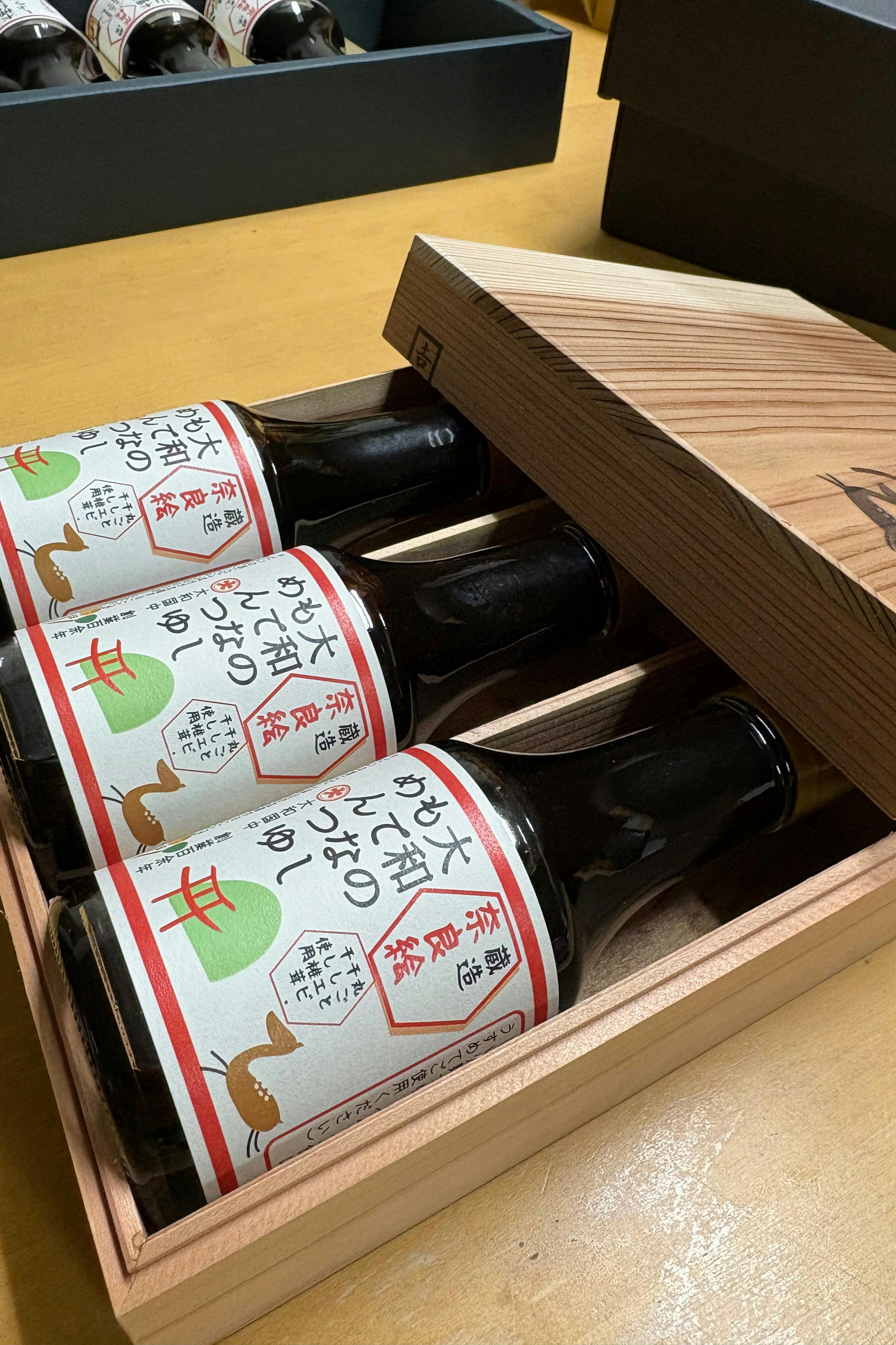 こちらは吉野杉箱に入ったギフトセットです。奈良・吉野は杉の産地としても有名ですが、木桶の素材にも杉材の性質をもって使われています。写真は奈良で親しまれている麺つゆ。夏の風物詩として、そうめんは夏場の食を彩る味ですが、三輪山のふもとでは、昔からよく冬場の手仕事として素麺がつられていたらしいです。お盆時期になると親戚が集まる場に大鉢にもったそうめんを囲んで頂いた思い出から、海なし県らしい干しエビ、干ししいたけの素材を使ったそうめんつゆを考案。奈良の人々には懐かしい麺つゆの味です。
