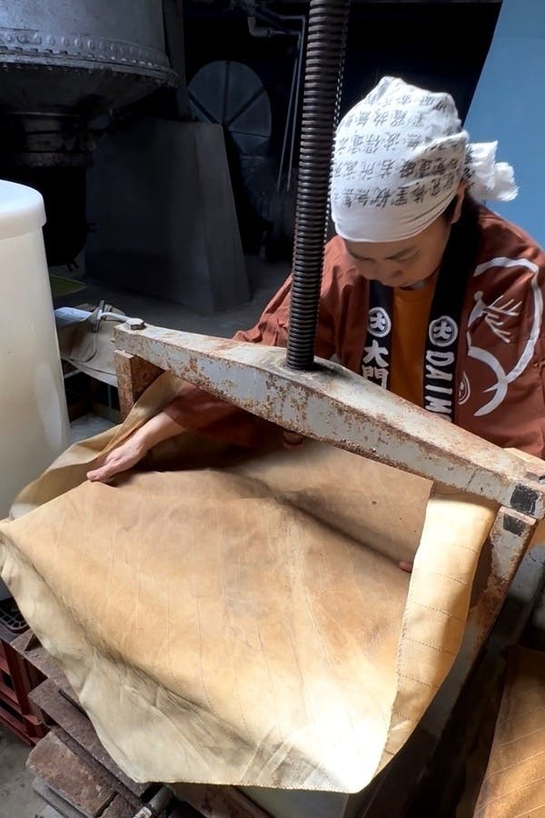 風呂敷状の布の上に出来上がりのもろみを入れ、箱状のワクの中に積み重ねていくと重みで醤油の液が布を通して出てきます。