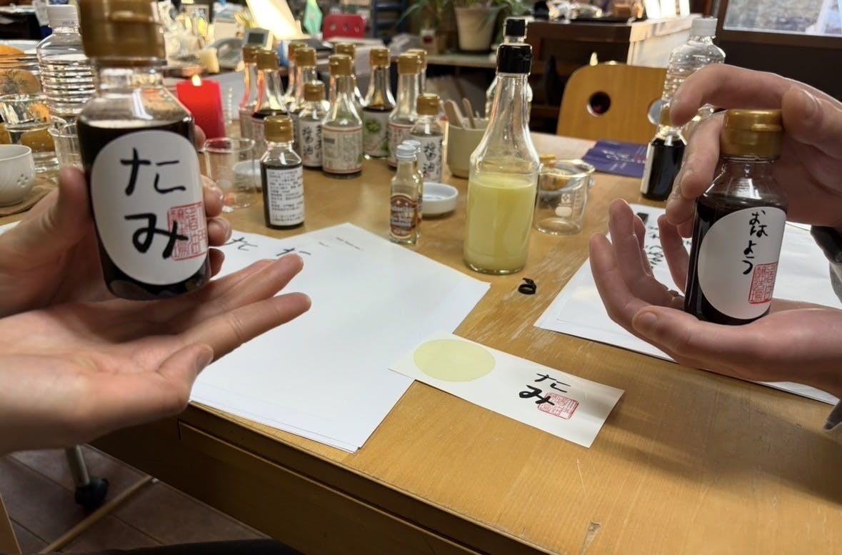 自分の好きな配合にして、ぽんずを作ってボトルに詰め、最後はラベルを墨で描いて作ります。