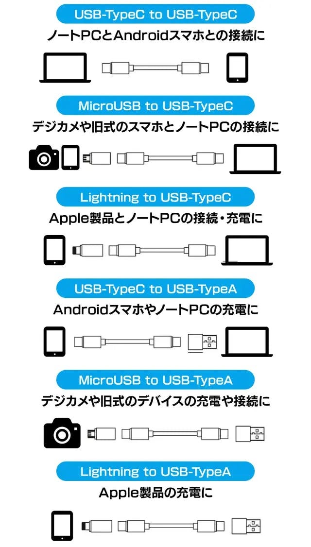 【6in1CABLE SET】は長さ48cmのUSB-TypeC to USB-TypeCケーブルと、USB-TypeA、MicroUSB、Apple製品用Lightning の3つのアダプタを1ケースにセット。