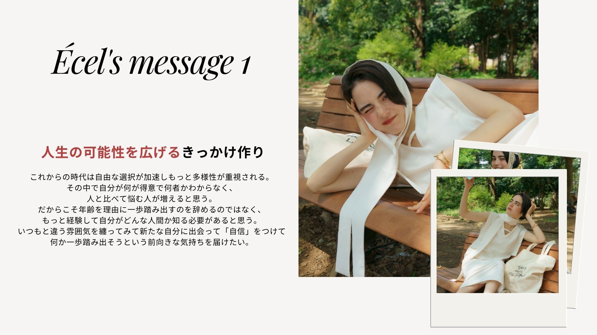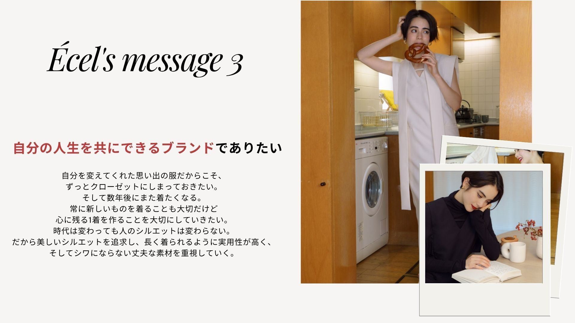 Écelは日常に”寄り添う服”を通じて、皆さまの人生の一歩を踏み出す応援をしていきたいです。