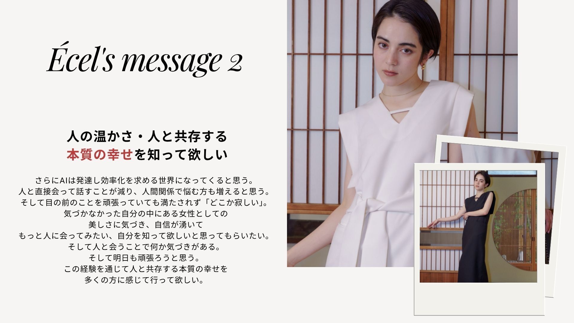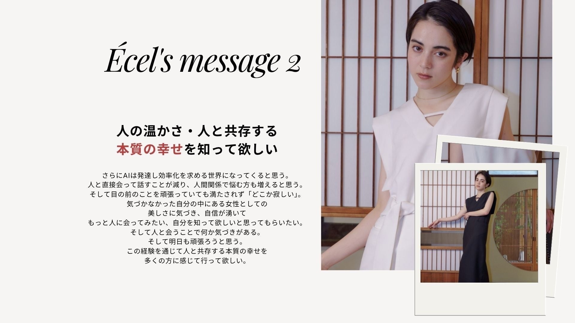 Écelは、私がこれまでに感じてきた人々への感謝への想い、そして現代社会への違和感を表現しています。ネットで全て成立してしまう今の時代だからこそ、『人との繋がりから得られる真の幸せ』を感じ、自分の人生を生きてほしい。という思いでブランドを設立いたしました。