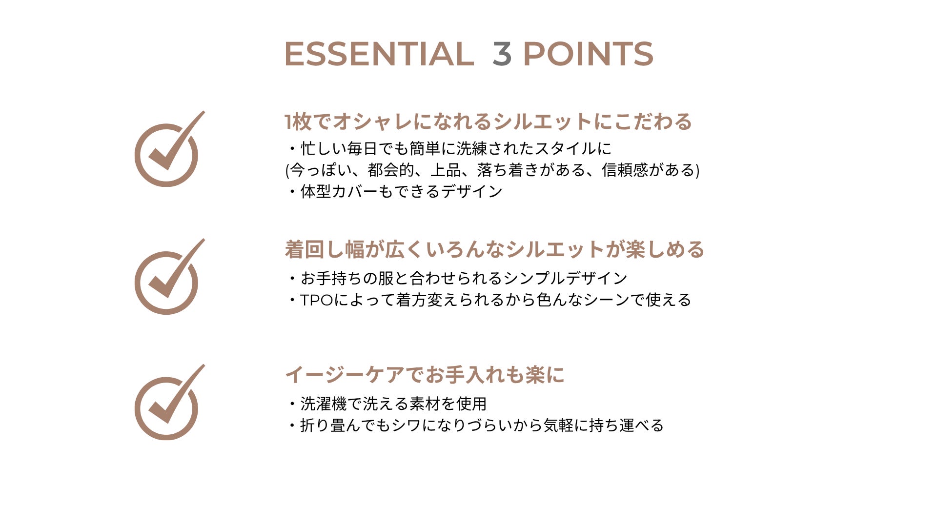 ・アイテムの量産(シワになりづらく長く着用できる生地・縫製・検品など)