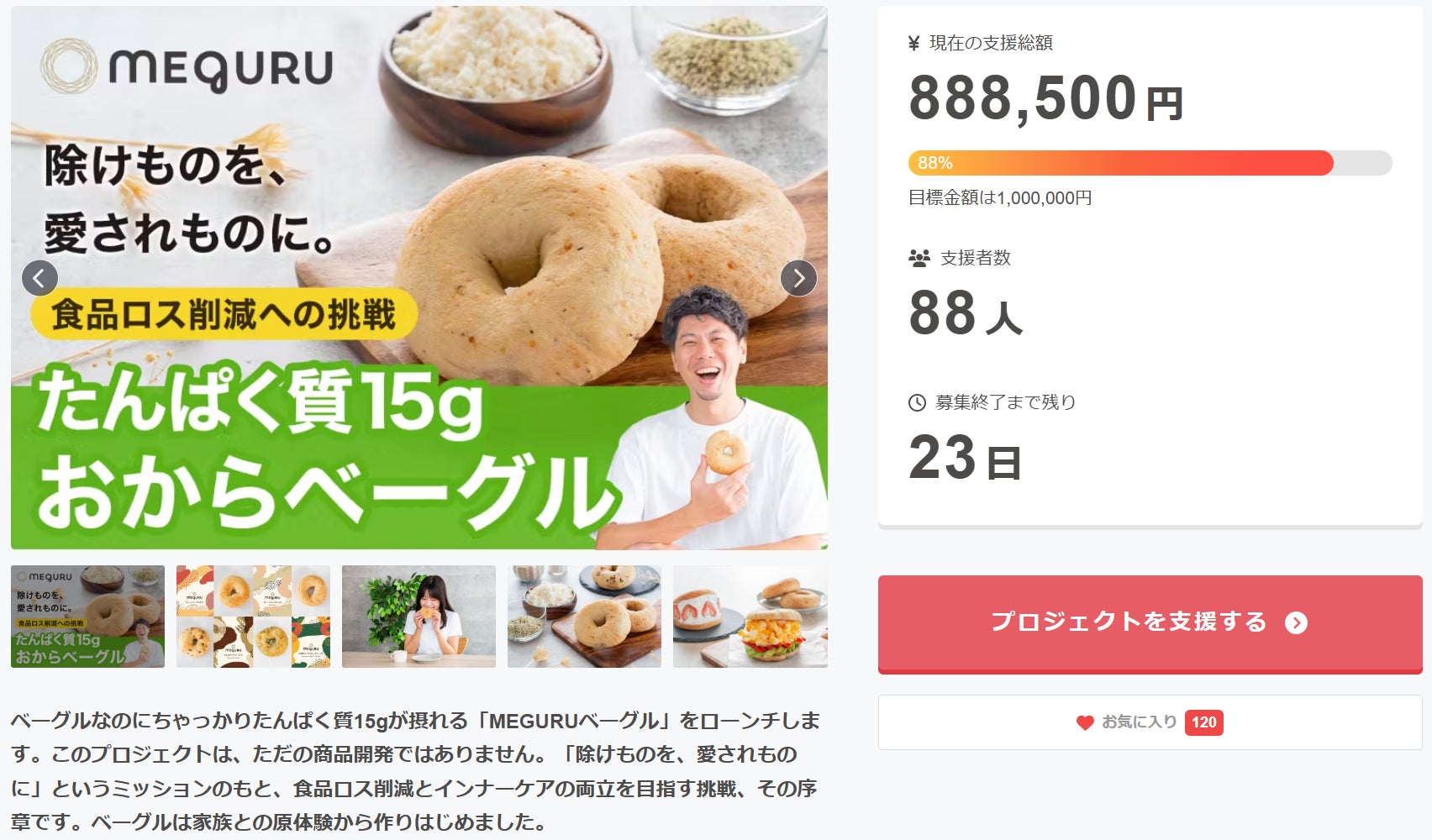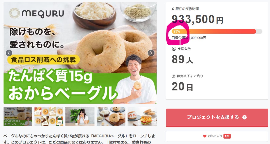 MEGURUベーグルのプロジェクトオーナーの阪脇です!来ました・・・。おかげ様で88%まで到達することができました!早いものでもう折り返しを過ぎています。ご支援いただける期間も迫って参りましたので、ぜひこの週末にご検討ください^ー^
