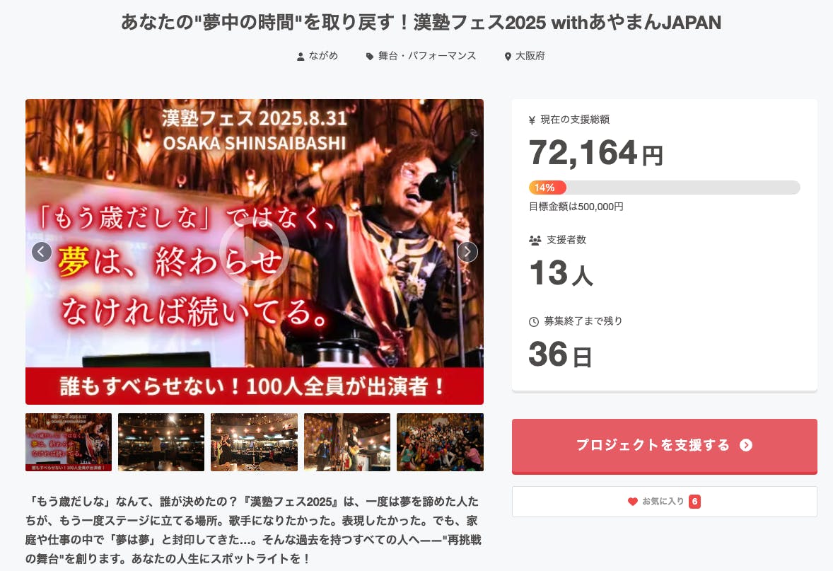 なんと現在、13名のあなたから72,164円のご支援をいただいております!