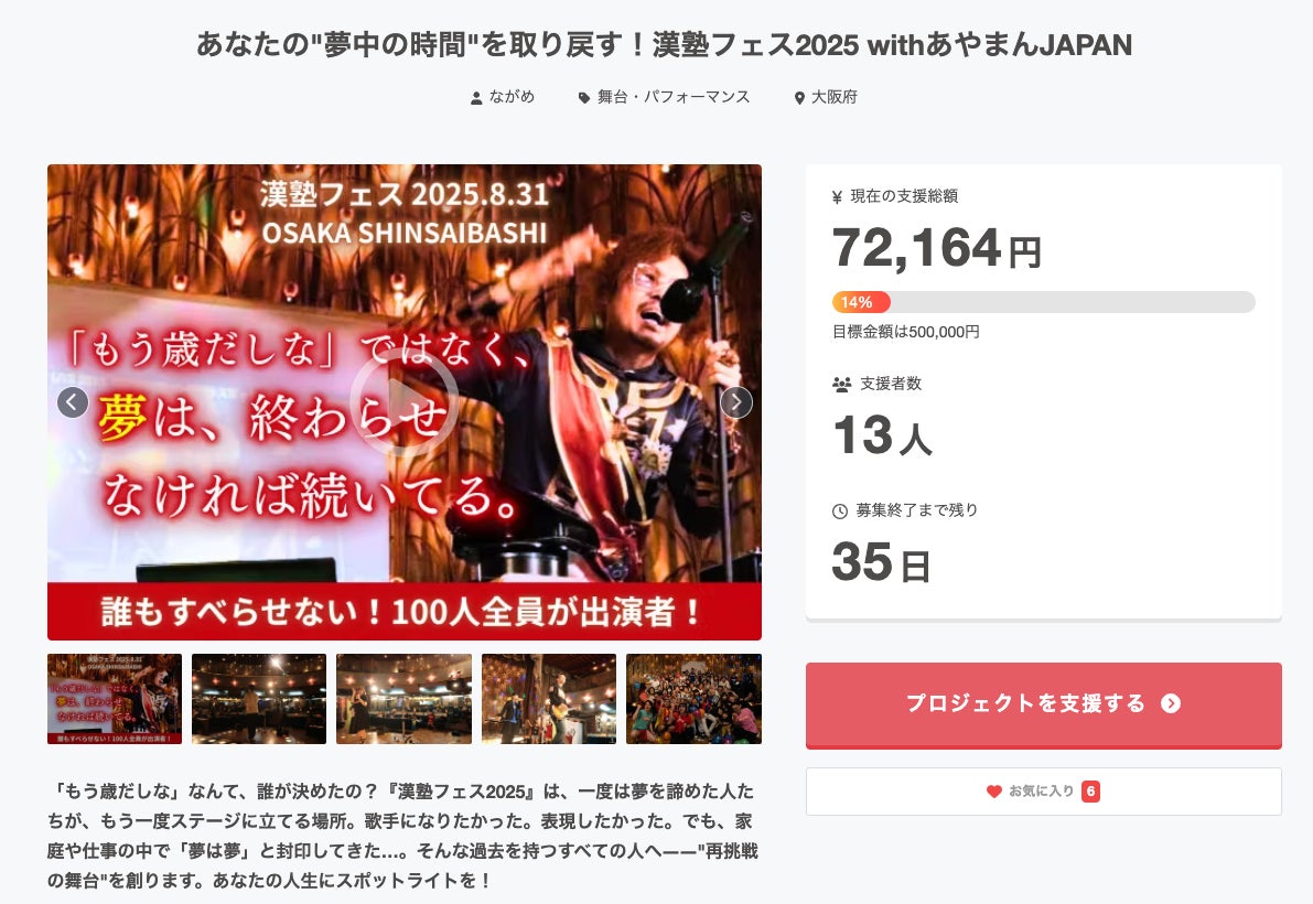 漢塾フェス2025のクラウドファンディングスタートから10日が経過し、13名のあなたから72,164円のご支援をいただいております!応援いただきありがとうございます!