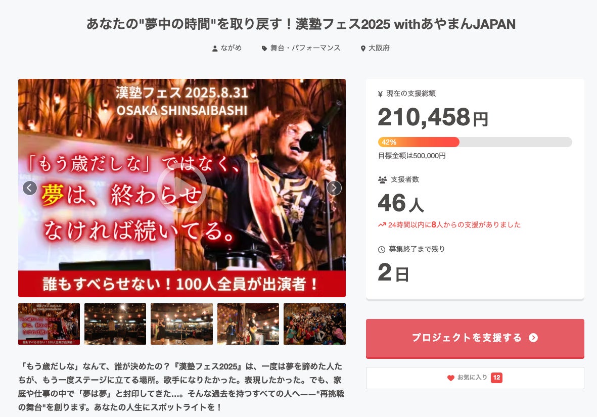 現在、46名のあなたから210,458円のご支援をいただいています!