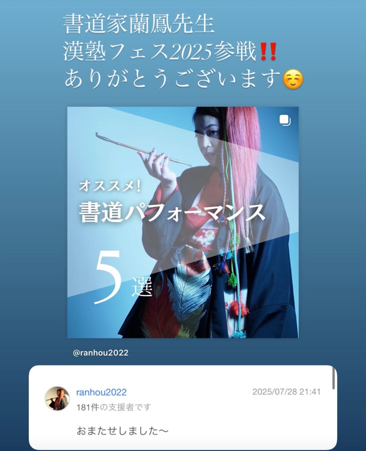 漢塾のロゴを制作してくれた書道家・蘭鳳先生が、パフォーマンス出演でエントリー!