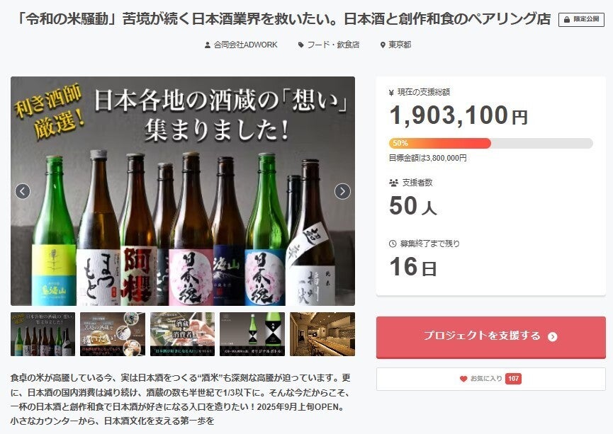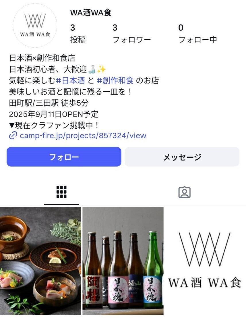 2025/09/01 10:00「WA酒WA食」のクラウドファンディングは、皆さまのお力添えにより無事に終了いたしました。心からのご支援をくださった方々、そして想いを共にしてくださった全国の酒蔵の皆さまに、熱い感謝を申し上げます。皆さまの応援は、私たちの大きな勇気と原動力となりました。この力を必ず形にし、日本酒をもっと身近に、もっと好きになっていただける場をつくりあげます。酒蔵とお客様をつなぐ新しい日本酒体験を、全身全霊でお届けすることをここに誓います。「WA酒WA食」は田町駅徒歩5分、9月11日オープン。小さなお店から始まる大きな挑戦に、ぜひ立ち会ってください。WA酒WA食|合同会社ADWORKスタッフ一同 もっと見る