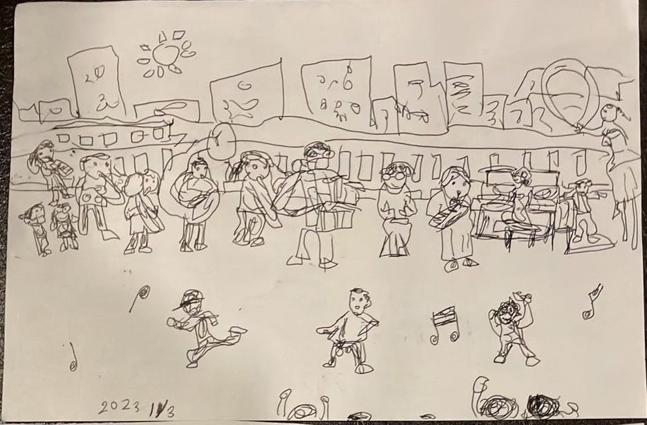 ストリートピアノすみだ川にはたくさんの子どもたちが参加してくださっています。今日は参加者のうちの1人、Rくんが2023年に描いたストリートピアノすみだ川の絵をご紹介!