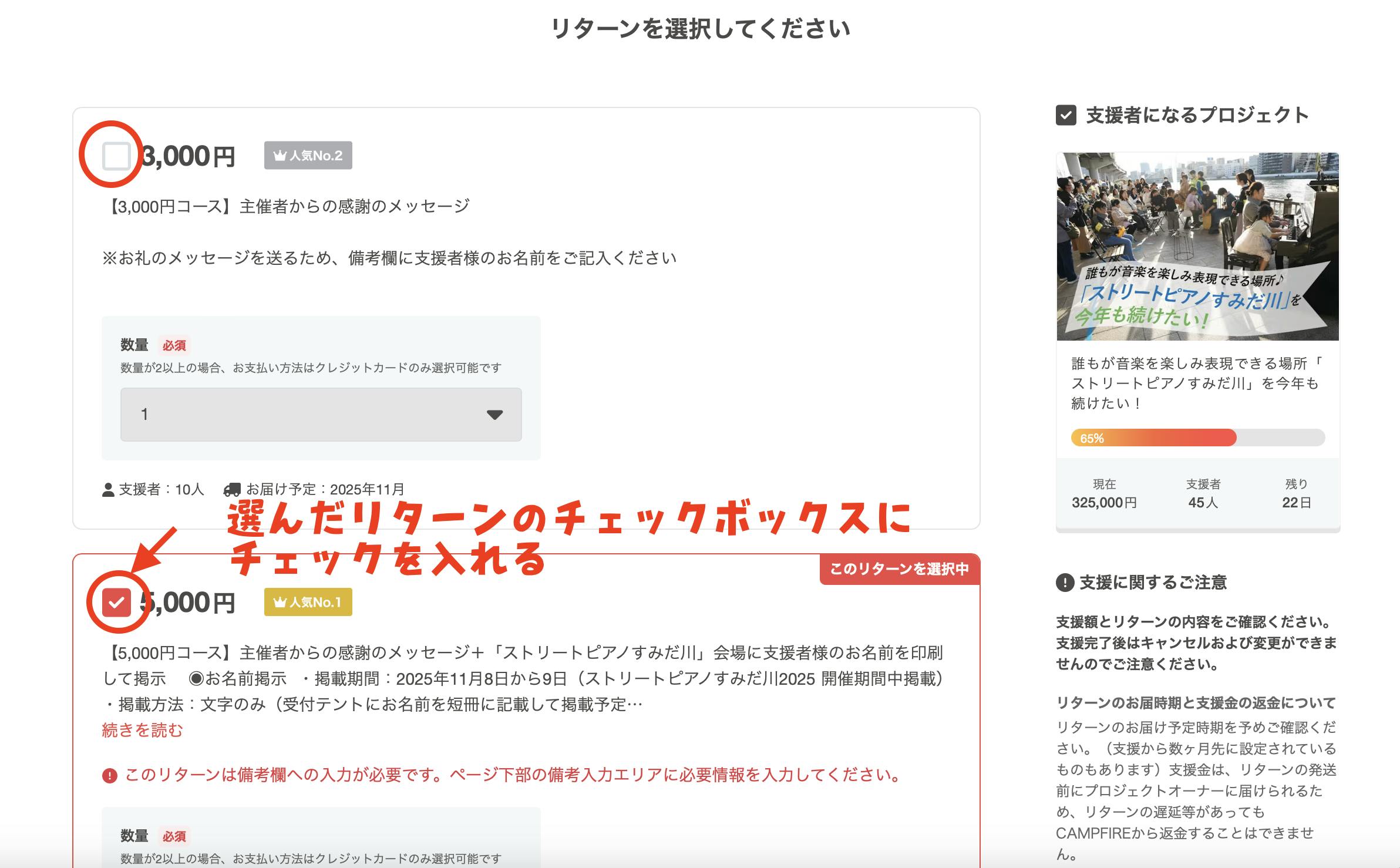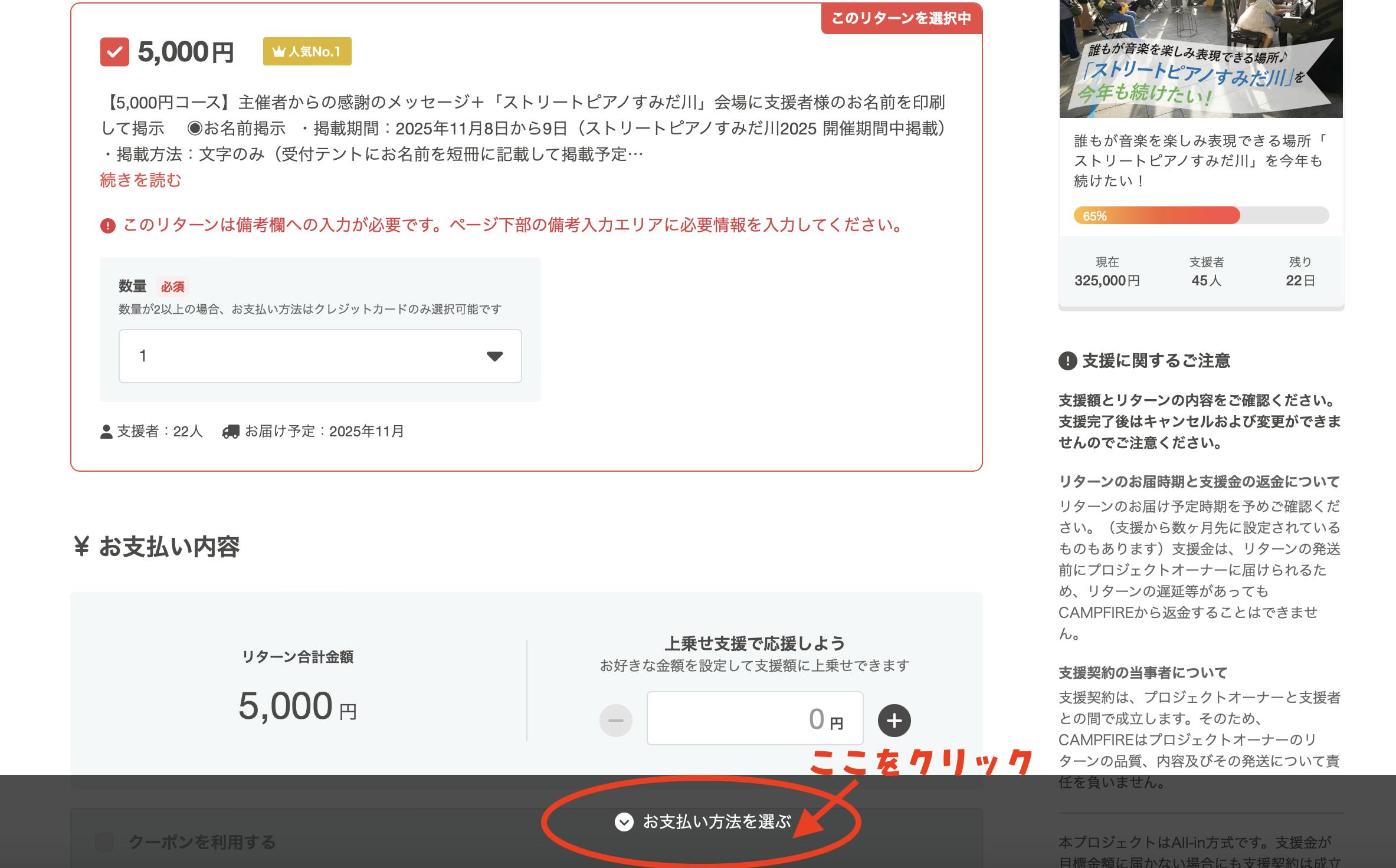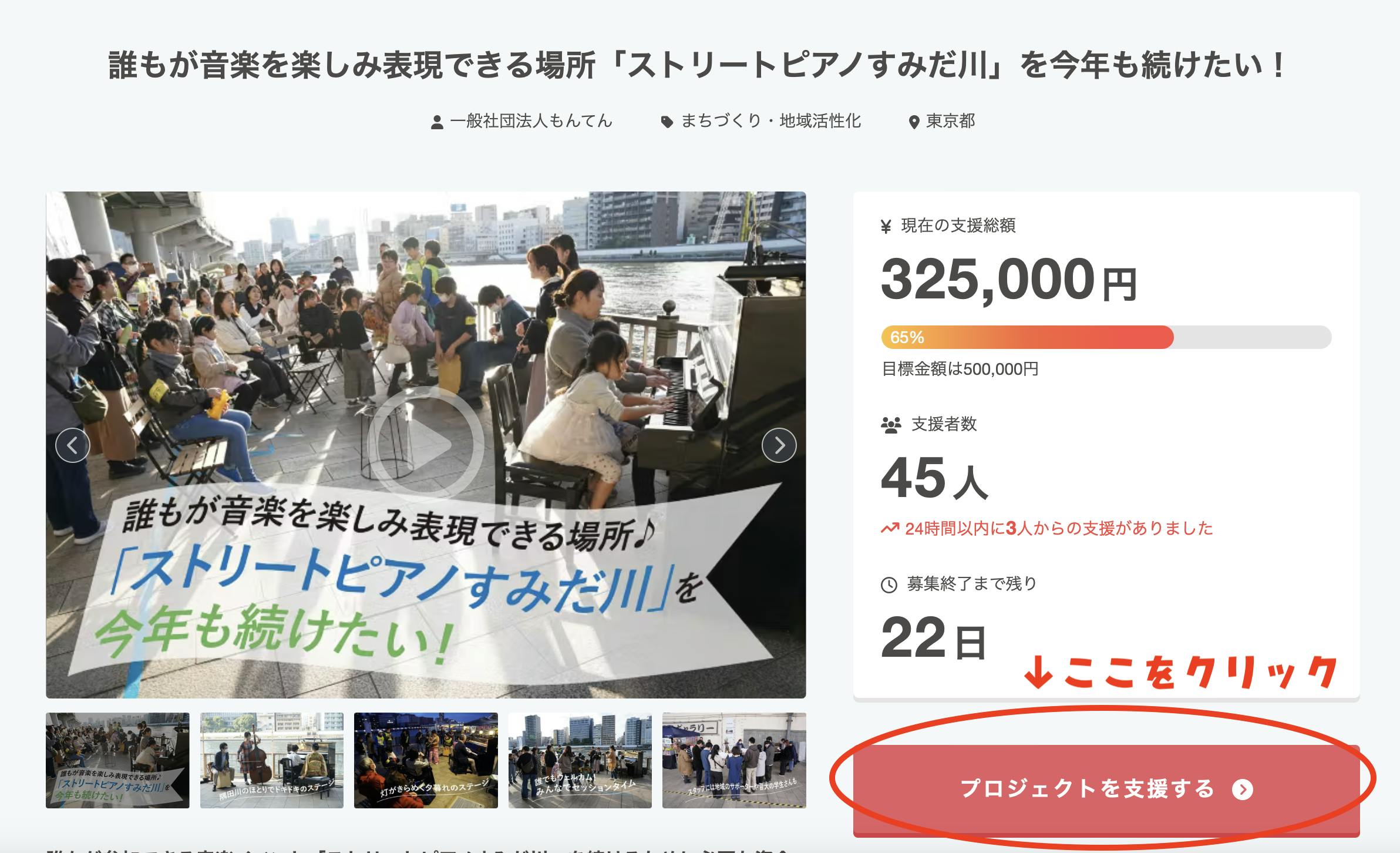 ①まずは、CAMPFIREのページから「ストリートピアノすみだ川」で検索して、ページを開いてください。