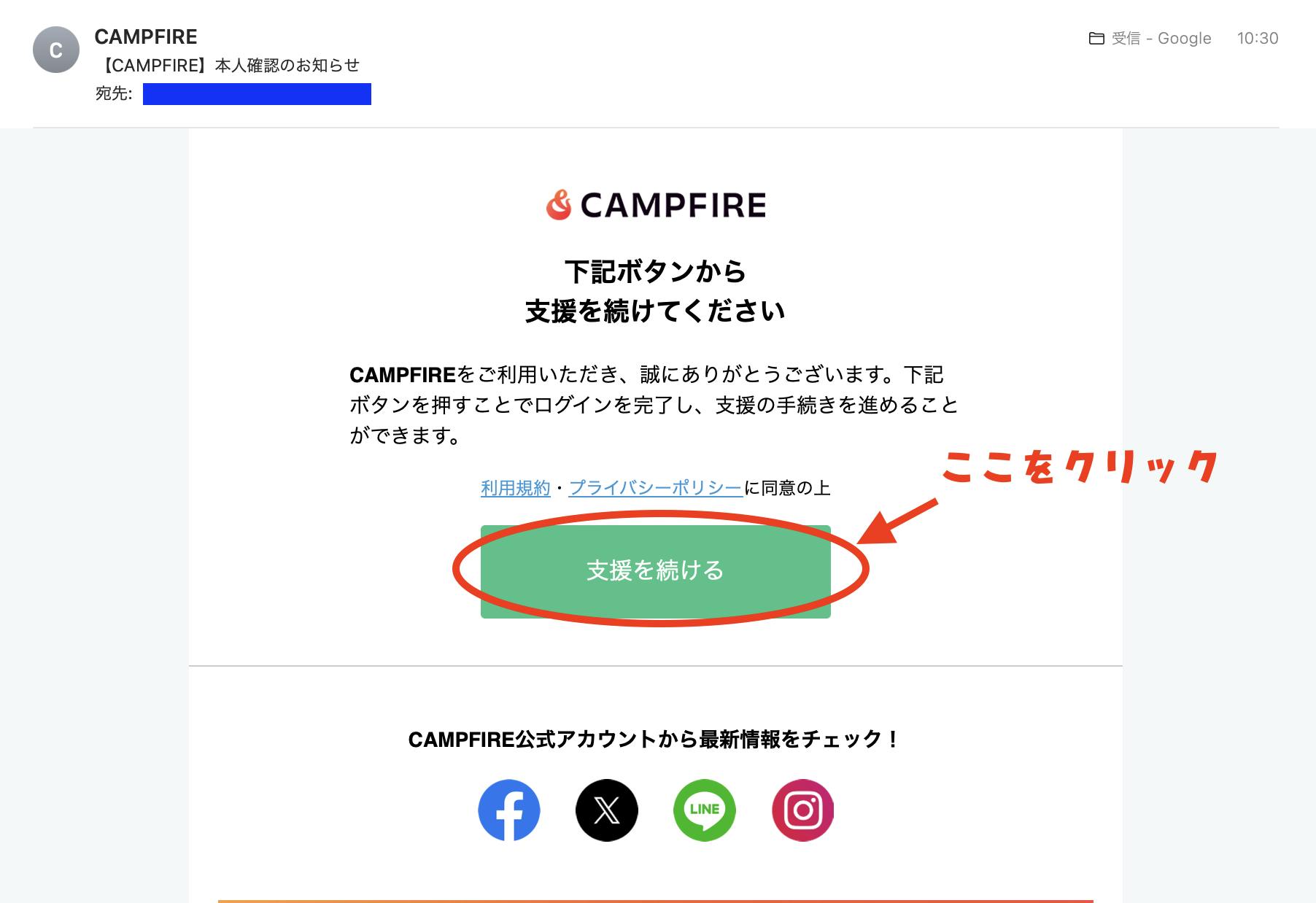 ③ご自身のメールソフトを開けてください。こういったメールが届きますので、「支援を続ける」をクリック。