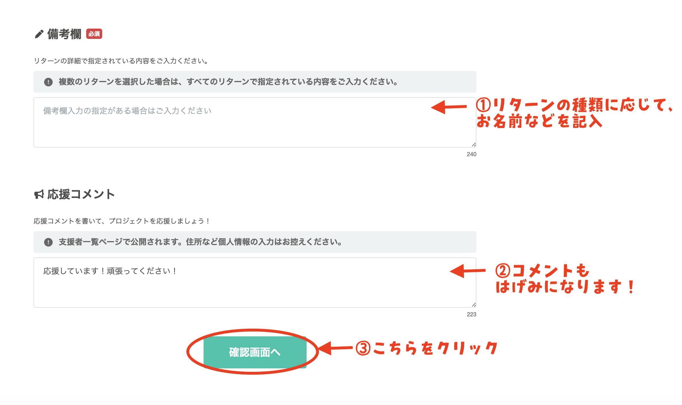 備考欄には、各リターンの種類に応じて、支援者掲載時のお名前などをお書きください。