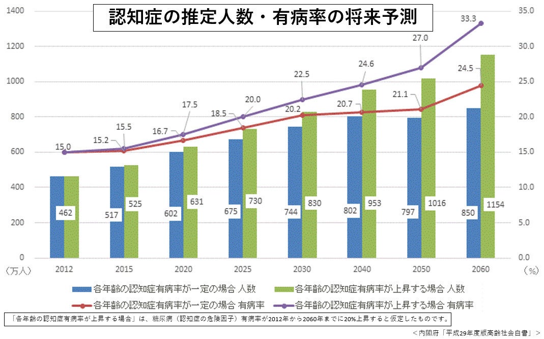 2025年には約675万人(有病率18.5%)と5.4人に1人程度が認知症になると予測されています。