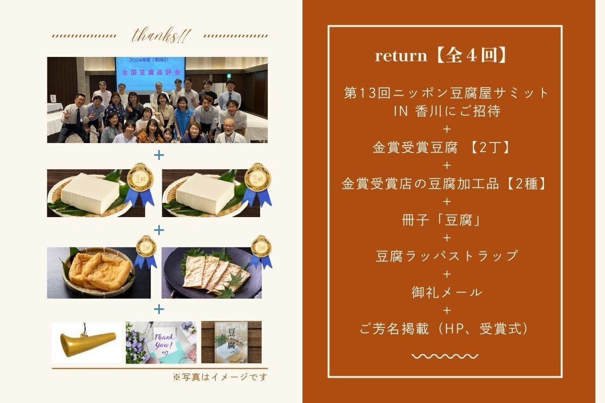 第13回ニッポン豆腐屋サミット in 香川にご招待します!また、金賞豆腐&豆腐加工品をお届けします。豆腐文化を継承しながら、さらなる豆腐の魅力を体験できる特別なセットです。