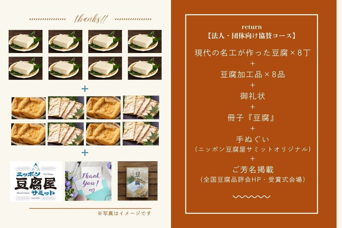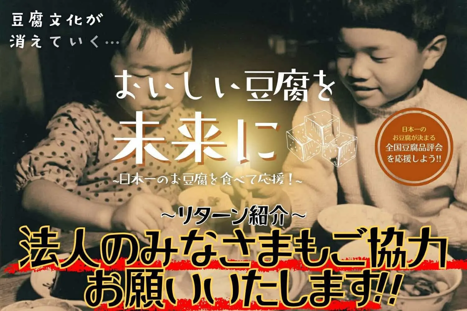 全国の豆腐職人たちが培ってきた技と文化を守り未来へつなぐための活動を、わたしたちだけでなく応援してくださる方々とともに継続しアップデートしていきます。企業・団体さまのご協賛は、地域の食文化支援や社会貢献としても大きな意義を持ちます。