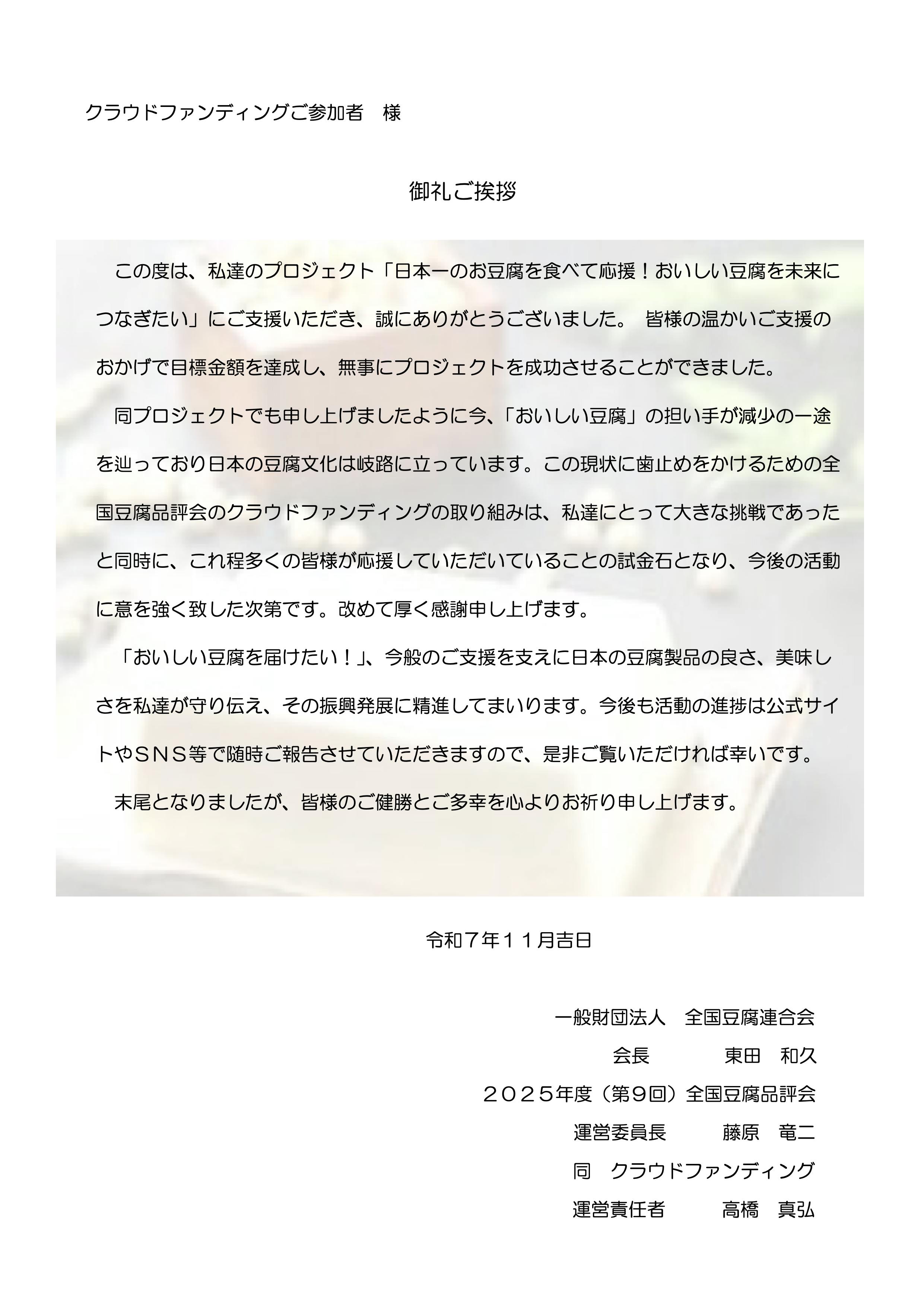 みなさま、このたびは「全国豆腐品評会」のクラウドファンディングに温かいご支援をいただき、誠にありがとうございました。