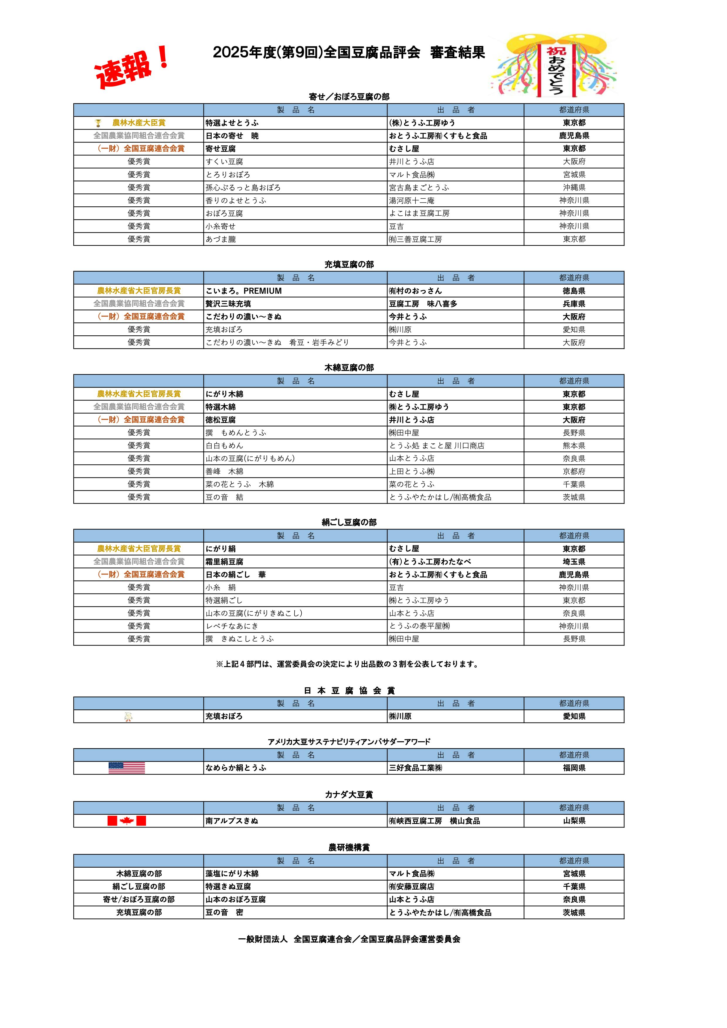 本品評会で高く評価された全国各地の“選ばれし豆腐”たちの一覧です。