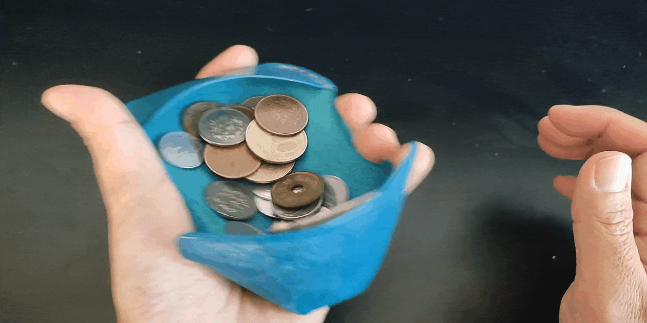 硬貨30枚、お札4枚程ぐらいがMAXの収納量です(動画は硬貨24枚、お札1枚)。